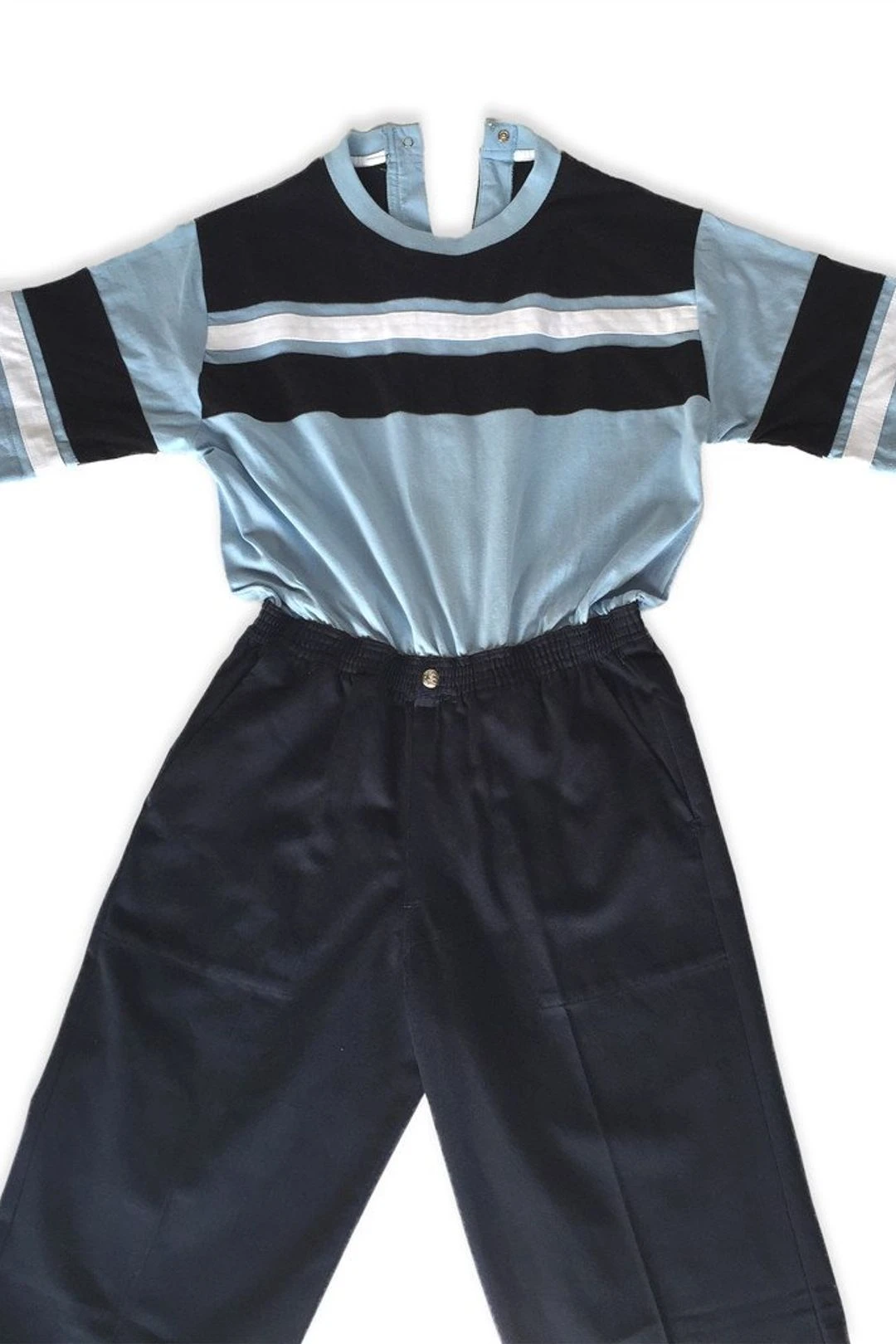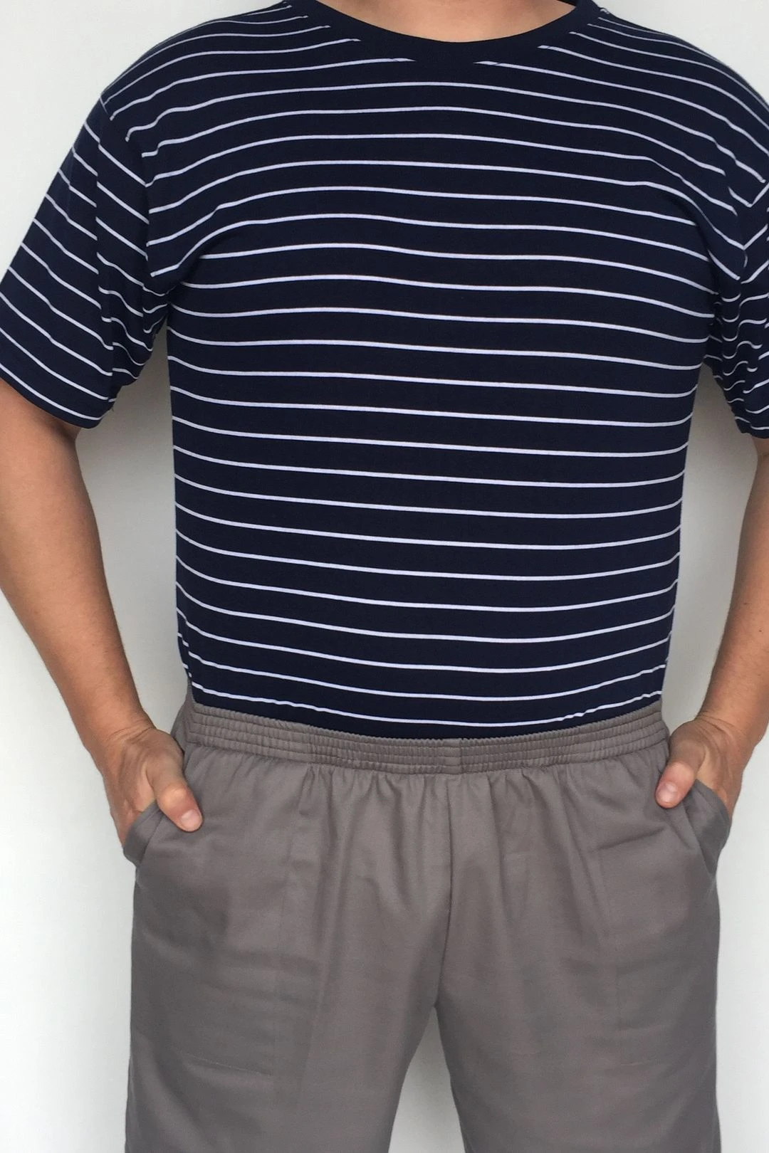 Men’s short sleeve jumpsuit with a zipper and a long strip of Velcro (R) on the back and hook and eye closure. Short sleeve printed or solid top matching a solid elastic waist pant that is sewn together. Works well for those who undress. A terrific body suit. All outfits are custom made feel free to call with sizes for an accurate fit. 1-800-422-2348  For a more accurate fit, you can add these sizes to the notes. Chest,waist,hip,inseam,torso(neck to crotch)Â