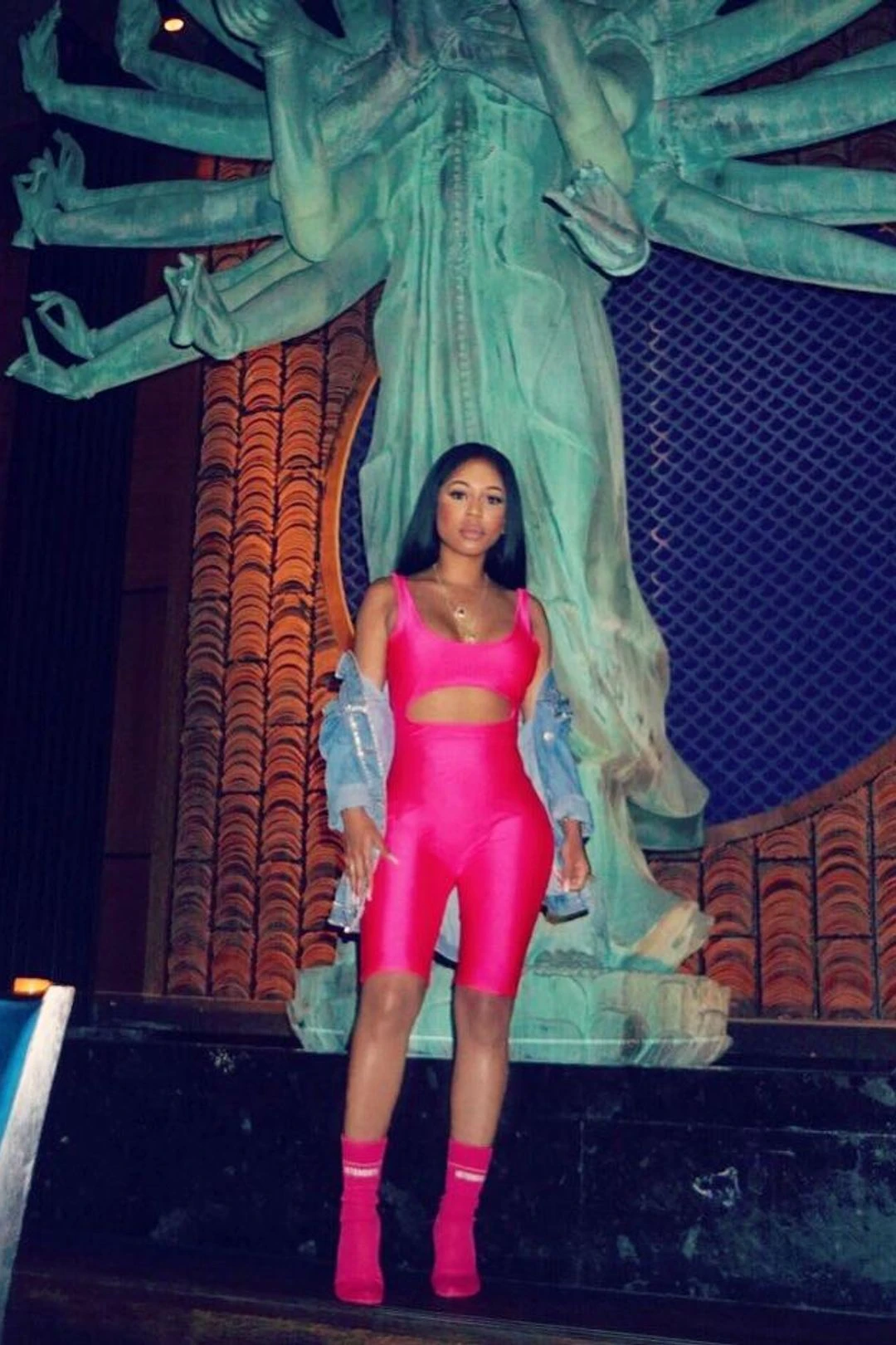 Shiny poly spandex biker jumpsuit. Cut out front . Low cut back. Extra stretchy. Bright neon color.Â