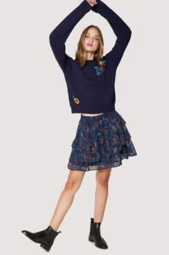 Look your best this season with the Midnight Festival Mini Skirt! This delicate design features slanted ruffles that add a unique touch to your look. The metallic shimmer stands out amongst the floral print shaping a high waisted elastic band for a comfortable fit.