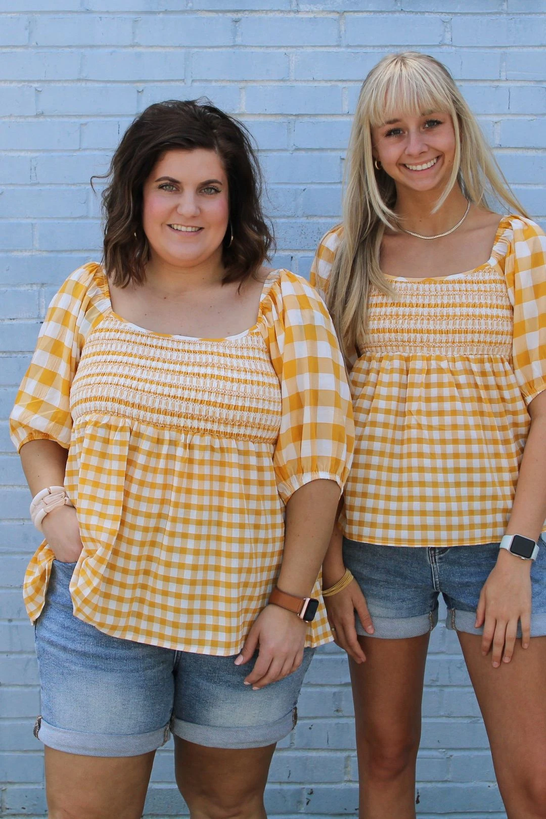 The cutest yellow and white checkered top is here! It has that rushed detailing in the front and a fun open back!Â