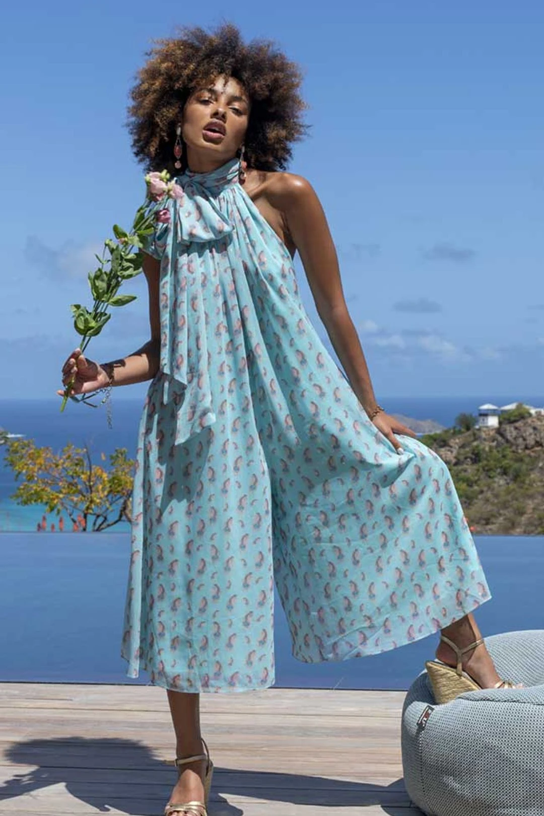 Be getaway ready in this sleek jumpsuit. Made of airy printed chiffon, this jumper has a halter neck and features our favorite detail – pockets! Pack this lightweight, easy number that is both practical and pretty – without sacrificing style. Tie at the neck in a dramatic oversized bow and let the fabric cascade down your back and you’ll look gorgeous both coming and going to your favorite events. Wear with slides and a sleek ponytail for a modern look, toss your keys and phone in the pockets and be ready for where the day takes you.