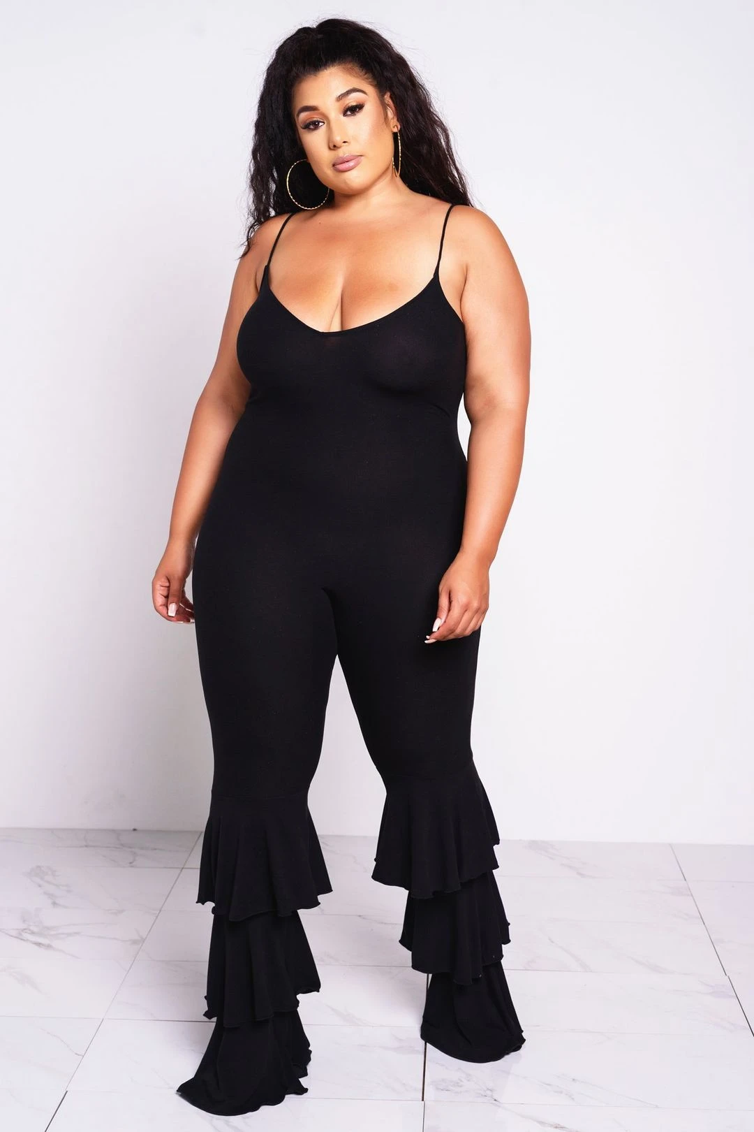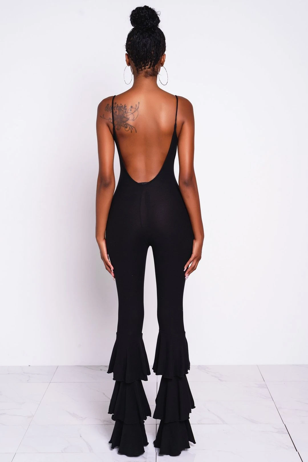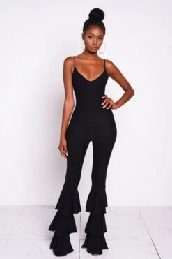 Black ruffle jumpsuit with large ruffle flared legs. Jumpsuit has scoop neckline, deep scoop back, and spaghetti straps. Jumpsuit has stretch.Â