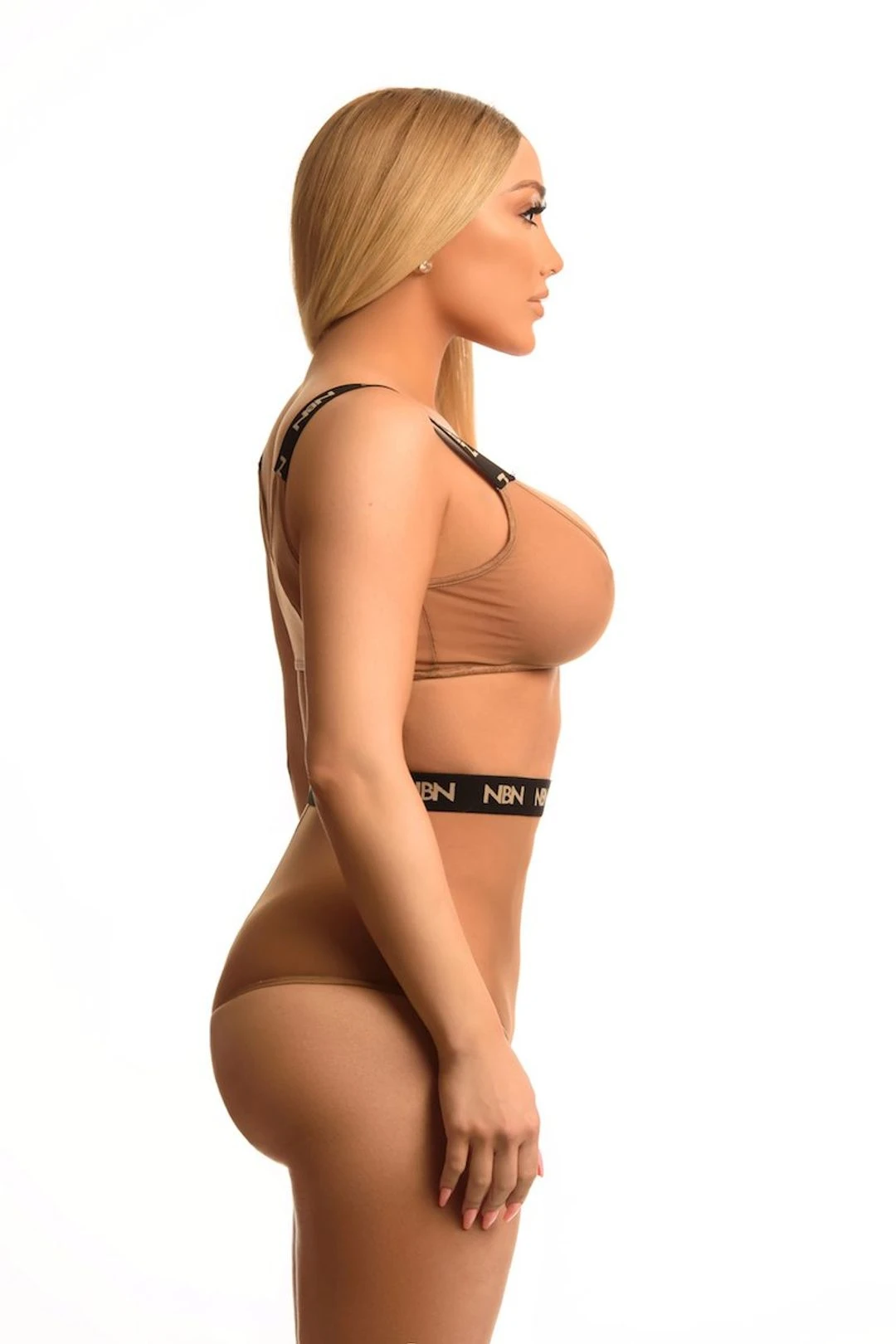 Features a wide elasticized logo band, sheer stretch mesh, and our Signature logo strap design.