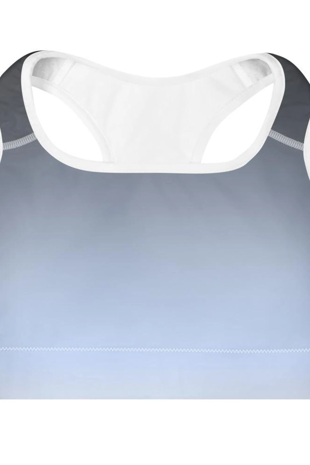 • Racerback with a scoop neckline in front and a wide elastic under breasts