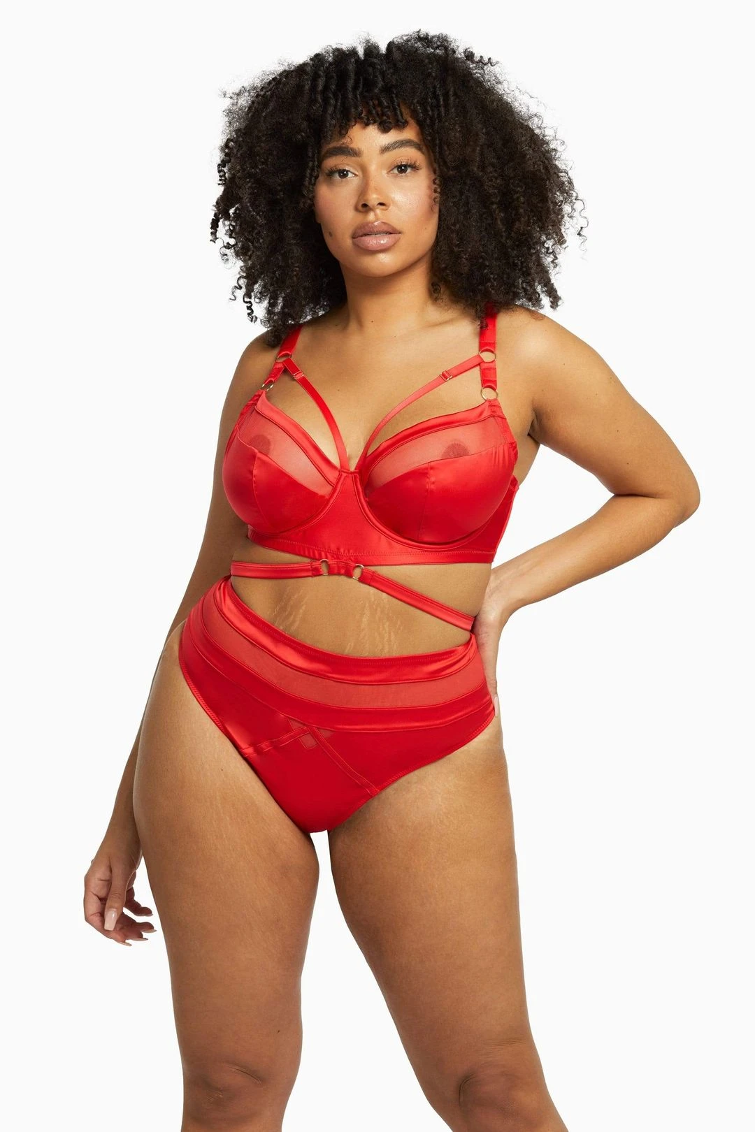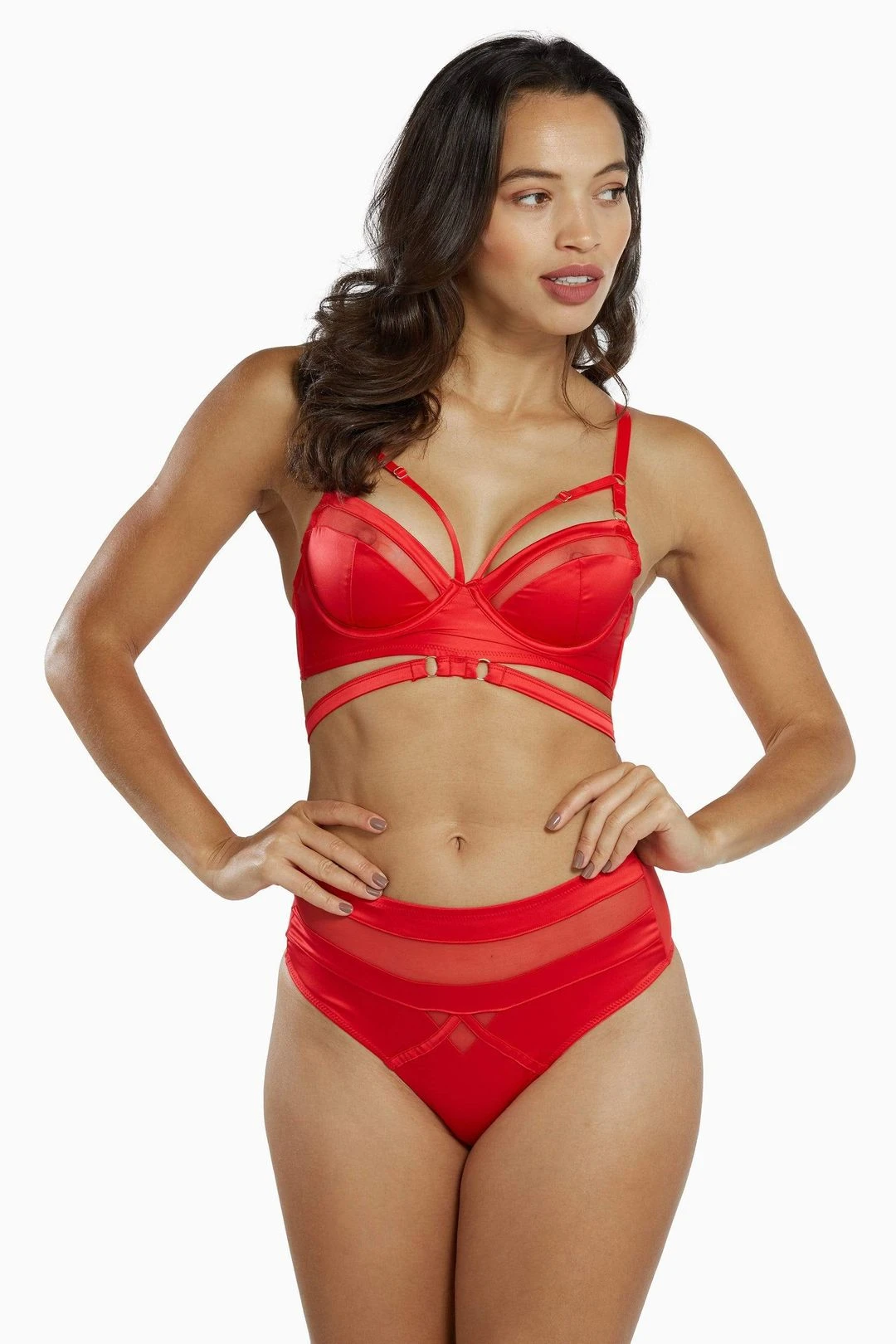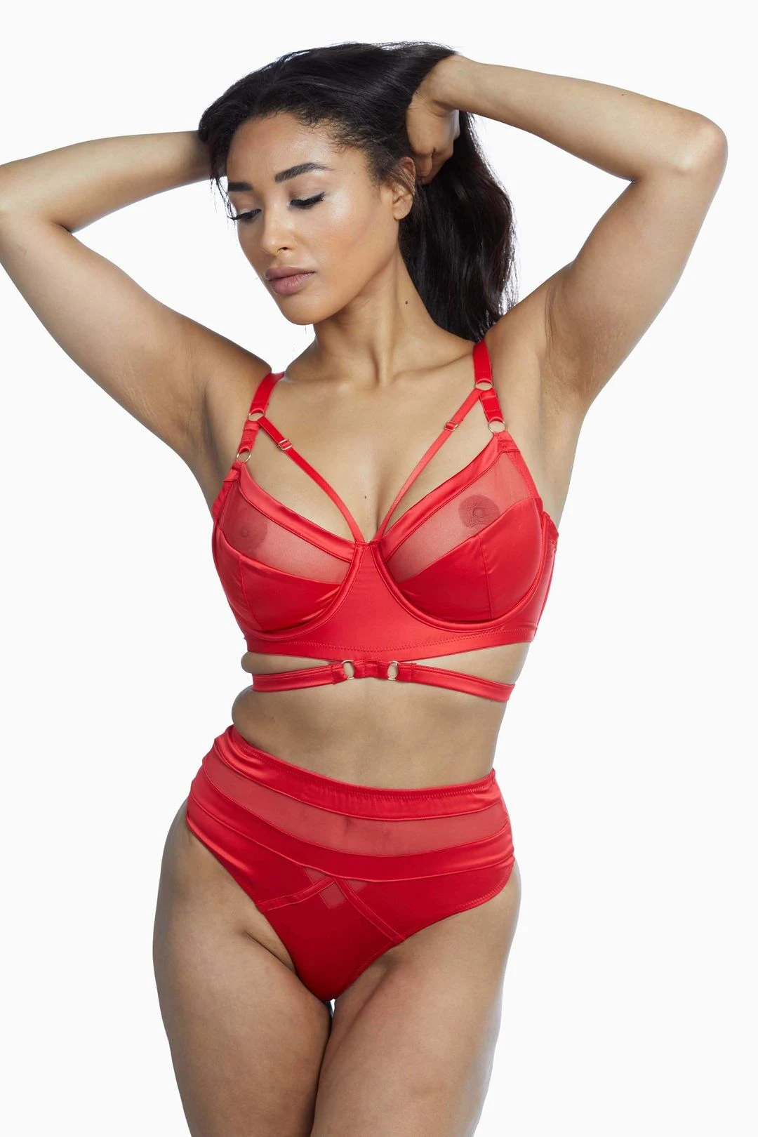 Feel mischievous in Madeleine! Now back in lipstick red. Smooth satin and mesh combines with adjustable strappy details. Finished off with a central bow and double straps from the cups. With this on, you’ll become your own eye candy.