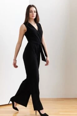 Pleated pant jumpsuit is sleeveless, has a wrap bustline in a V-neckline, includes a sash belt and features a pleated, wide full length pant.