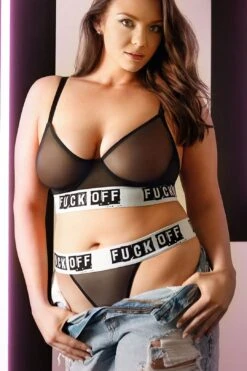 Tell your babe to beat it in this saucy plus size mesh bra set featuring sheer underwire cups, adjustable spaghetti straps, hook and eye back closures, an elastic underbust with repeating “FUCK OFF embroidery, and a matching g-string panty. (Shorts not included.)