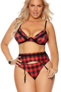 Highlight your curves in this plus size buffalo plaid print bra set featuring soft mono wire cups with lace trim, adjustable spaghetti straps, a hook and eye back closure, a matching garter belt with an adjustable hook and eye closure, adjustable garter straps, and a matching panty with a cheeky cut back.