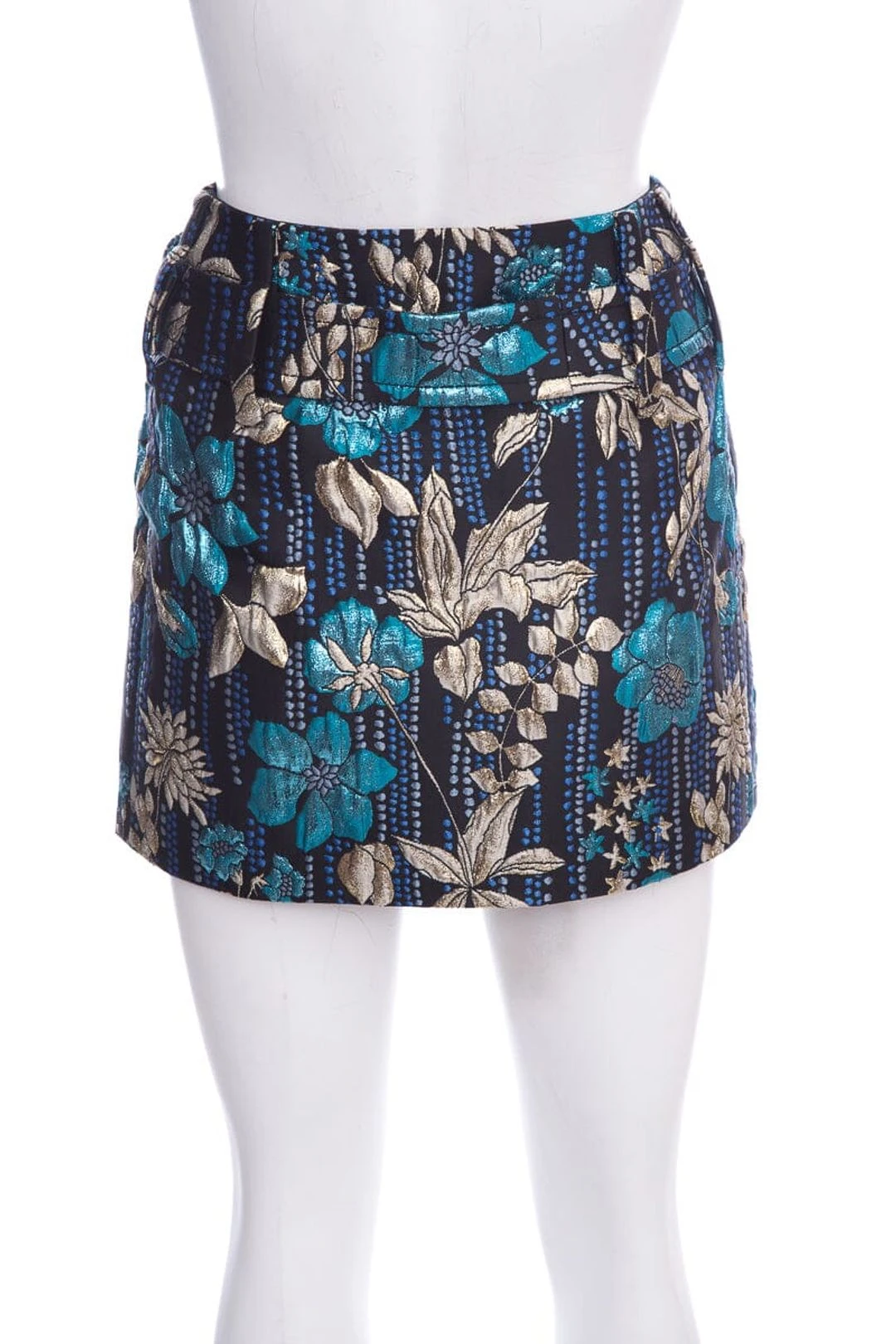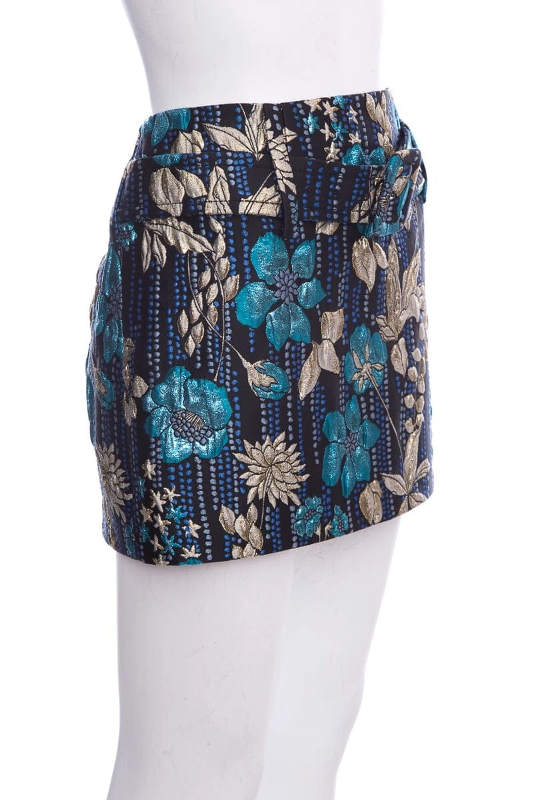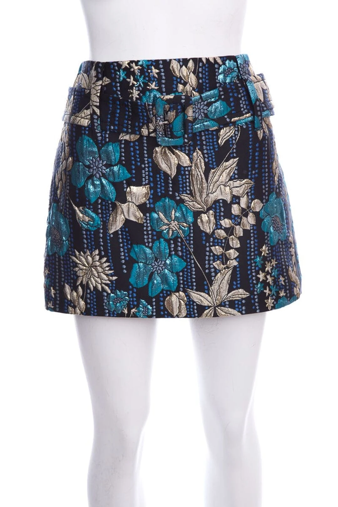 Prada Black/Blue Floral Printed Mini Skirt with Belt and Shimmer Detail. This item is in like new condition.