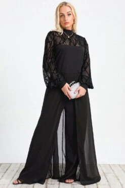 - Features Mesh panel, wide leg, lantern sleeves, zipper back, sheer train