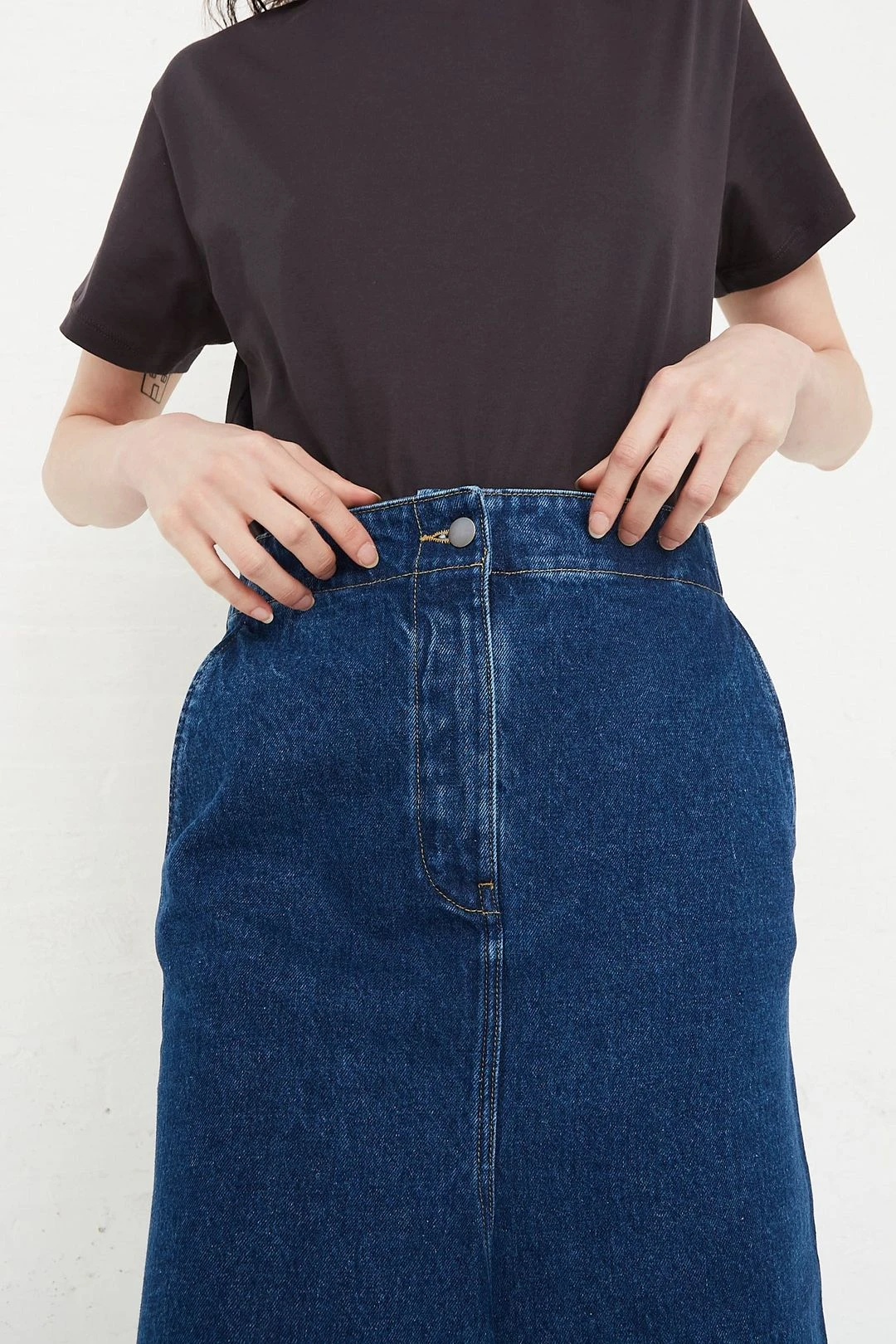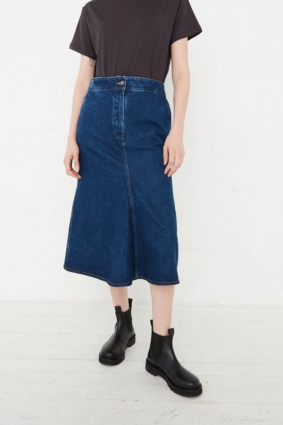 A high waist skirt in an indigo wash denim. Features a button and zip closure, center front kick-flare drape.