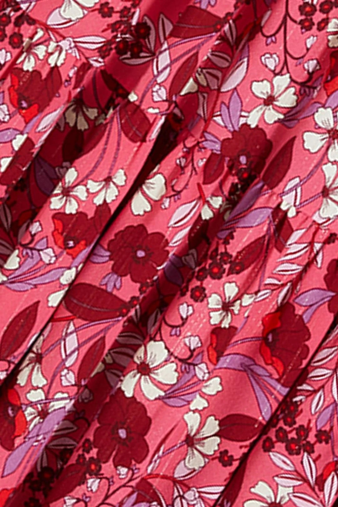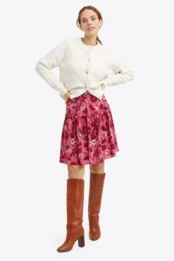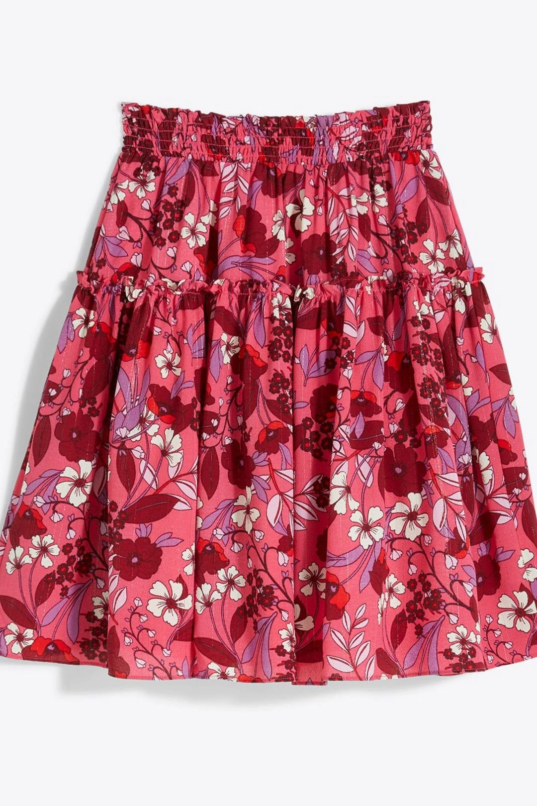Comfort and joy! Cut from an elegant raspberry matte crepe with sparkly gold lurex threading, the Pull-On Skirt in Clematis Floral is the life of the party. The perfect length, this flirty miniskirt has a smocked elastic waist for a perfect (and supremely comfortable) fit. Wear it with a T-shirt, cardigan and flats for day or a sweater and boots for night.Â