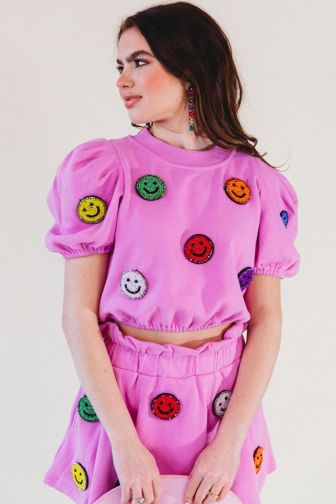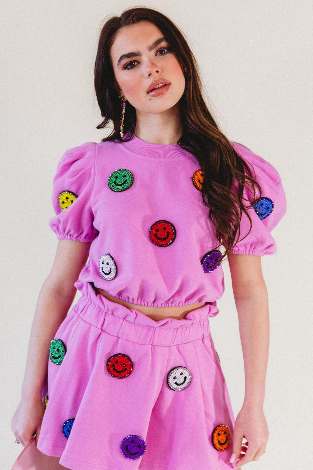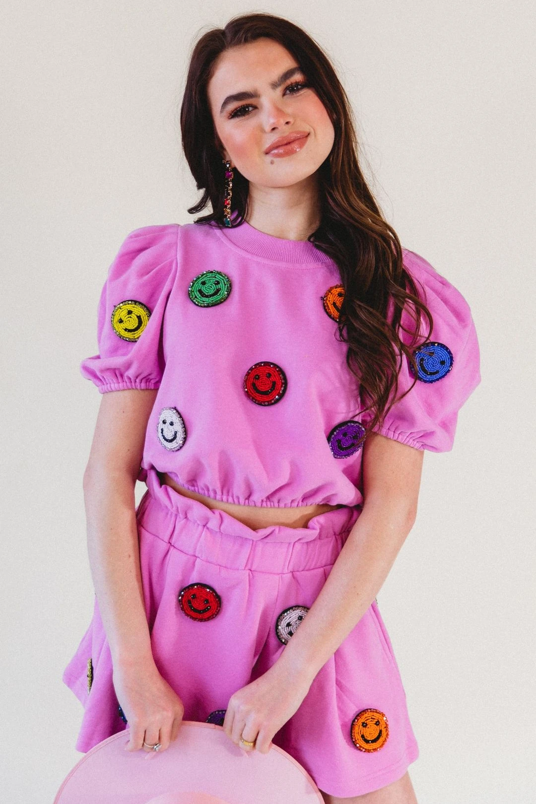 Smile Like You Mean It | Queen Of Sparkles. Cute does not even describe this top! It features a bubble sleeve with an elastic band and an elastic waist band around the bottom for the cutest fit. The smiley faces are completely beaded with beads that are full of all the bright colors. Pair it with the Smile Like You Mean It Skort, and you’re sure to look adorable.