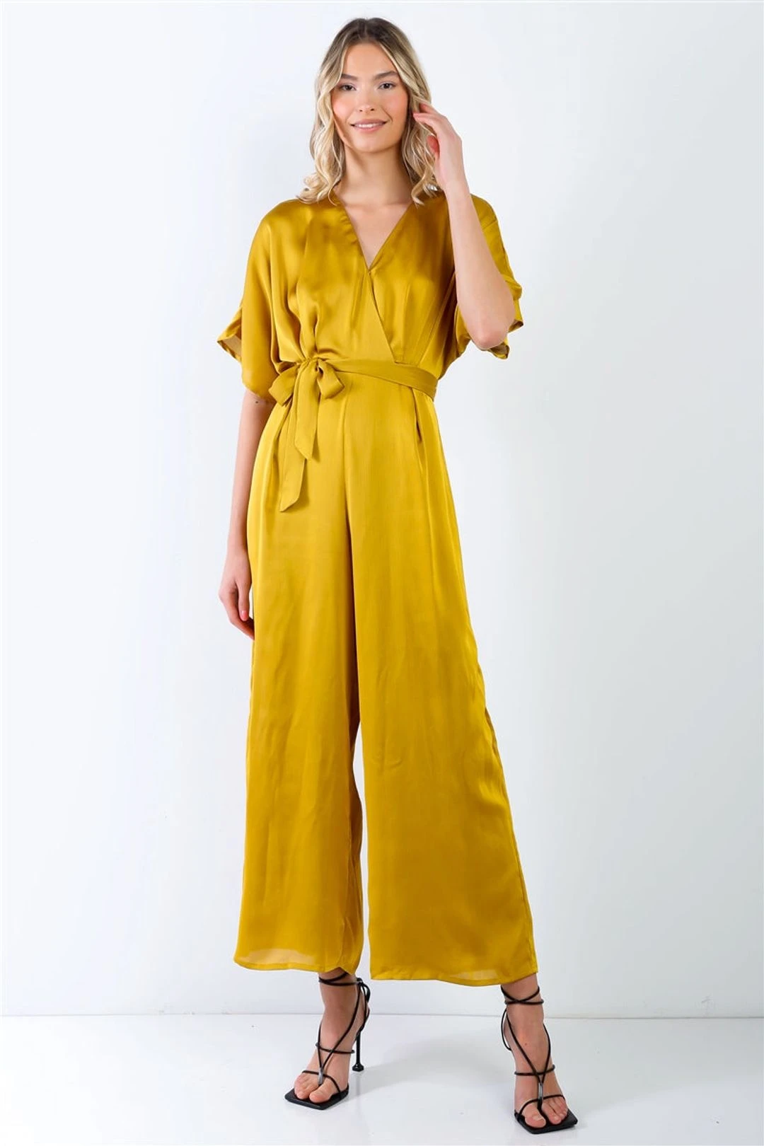 You will leave an impression when you wear our Quincy Satin Jumpsuit! It features a v-neckline, short dolman sleeves, self tie belt, and a back zipper closure. The yellow color is gorgeous ! It has wide legs and is lined. There is no stretch.