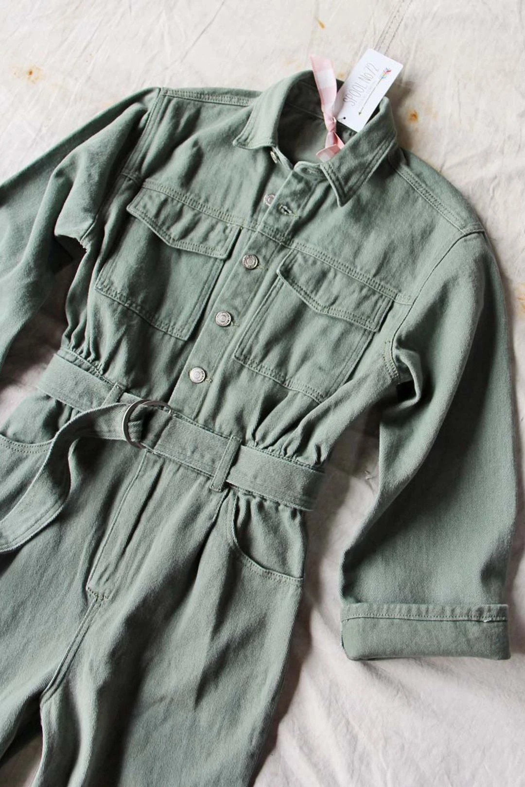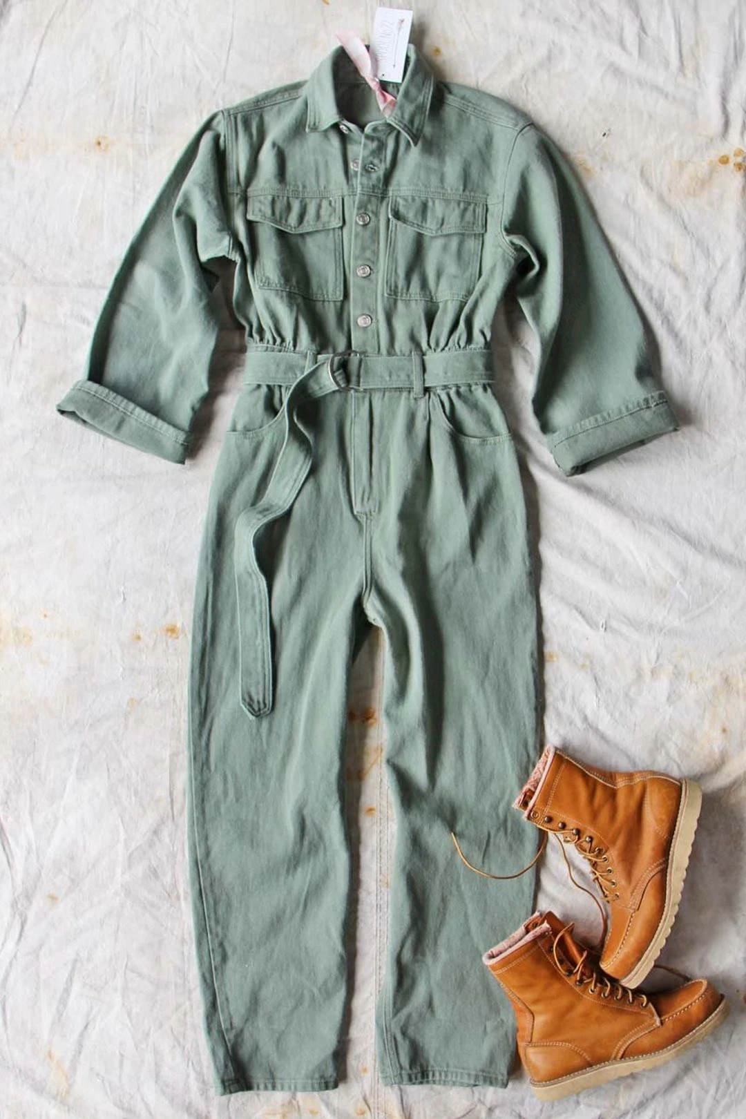 An all time staff favorite! A soft worn washed army green denim pairs with a button-up front, long sleeve design, front pockets, belted waist, & a cute vintage inspired fit. Easy fitting arms & legs.