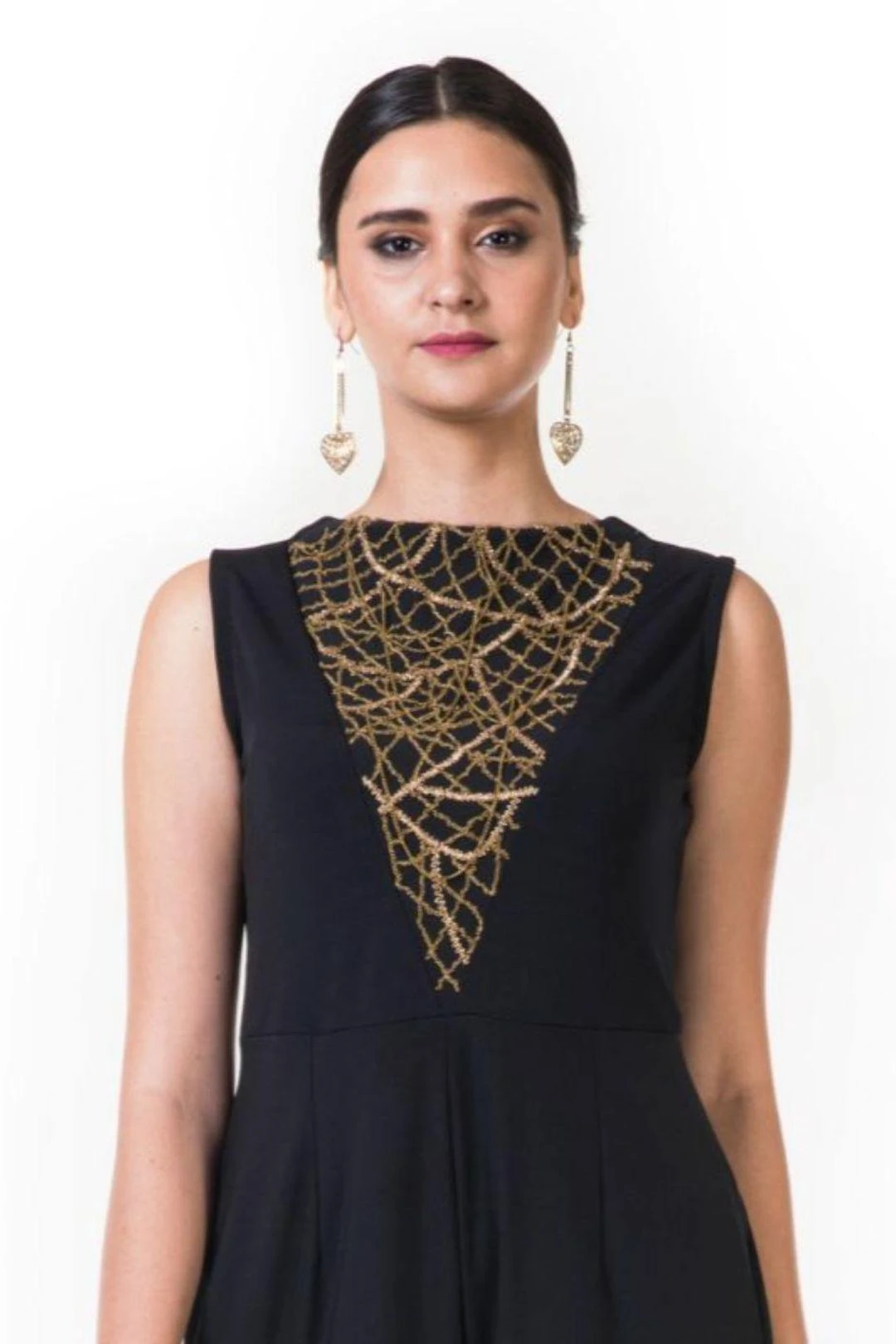 Featuring a Black Jumpsuit with a Chained Yoke Embroidery. The piece has a magnificent chain work embroidery places on the neckline