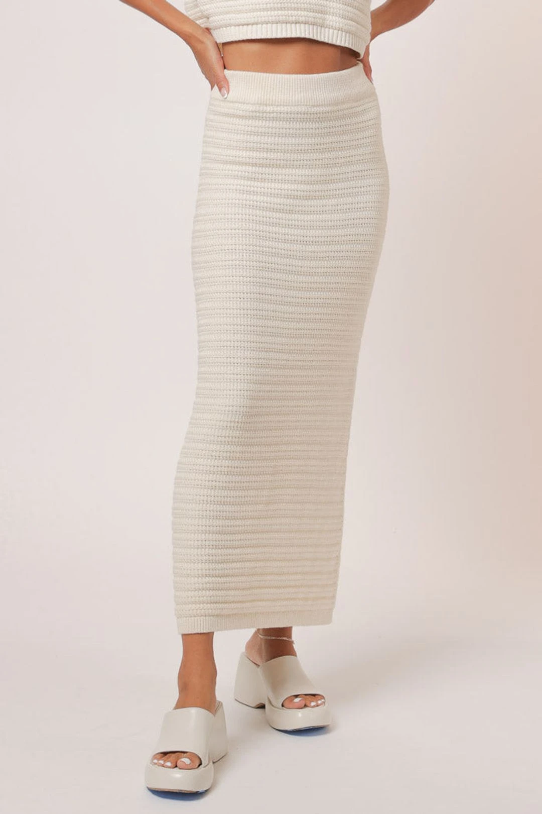 This knit skirt features a midi length and side slit. See Rico Top for a matching look!