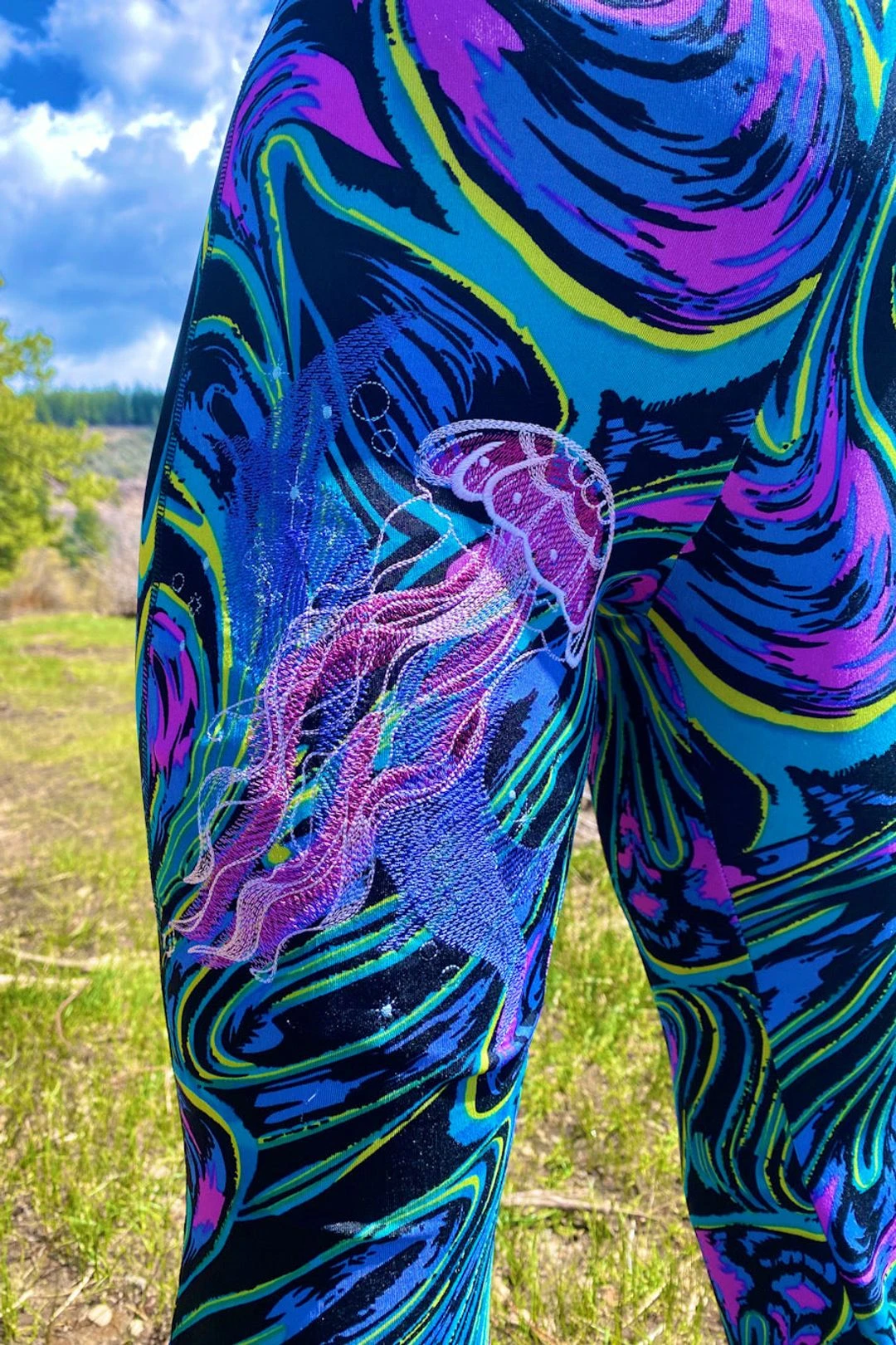 Each one of these jumpsuits has been beautifully adorned with a deluxe detailed jellyfish design by Lunar Embroidery.