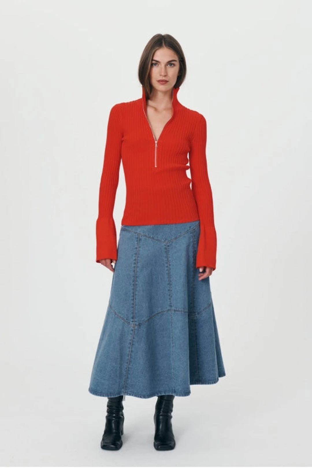 The Travis Zip Knit Top is a timeless piece crafted from a quality cotton knit fabric with a zero waste approach. Available in our best selling shade of Aperol Red, the Travis features a stylish funnel neckline, full length silhouette and half zip neckline with silver hardware. Bell cuff sleeves and a slim fit complete this elegant yet practical jumper, perfect for that effortless look.Â
