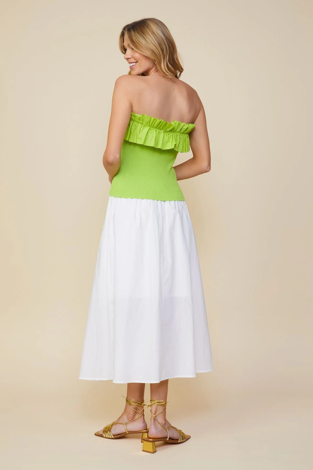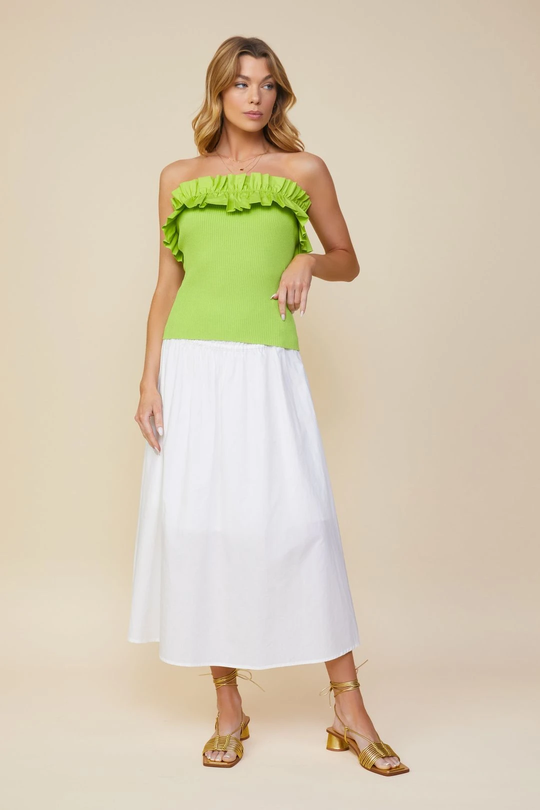 Dial up the color this season with this strapless top in a zingy lime green shade. Done in a fitted silhouette, it’s made from a curve-clinging rib knit and topped with a woven ruffle for a fun, playful touch.