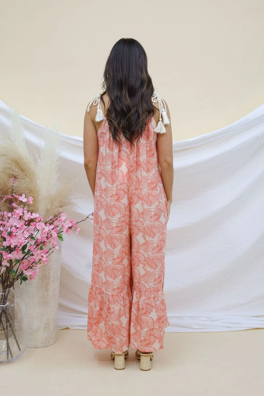 Escape to paradise and run away with style in our Running Away Printed Jumpsuit! This jumpsuit will have you dreaming of sandy beaches, swaying palm trees, and sipping colorful cocktails under the sun. The rope tie straps add a playful and nautical touch, while the wide-leg silhouette ensures comfort and freedom of movement. Dress it up with statement earrings and wedges for a beachside dinner or pair it with sandals and a wide-brimmed hat for a casual yet chic daytime look. Runs true to size but you can always size down if in between!Â