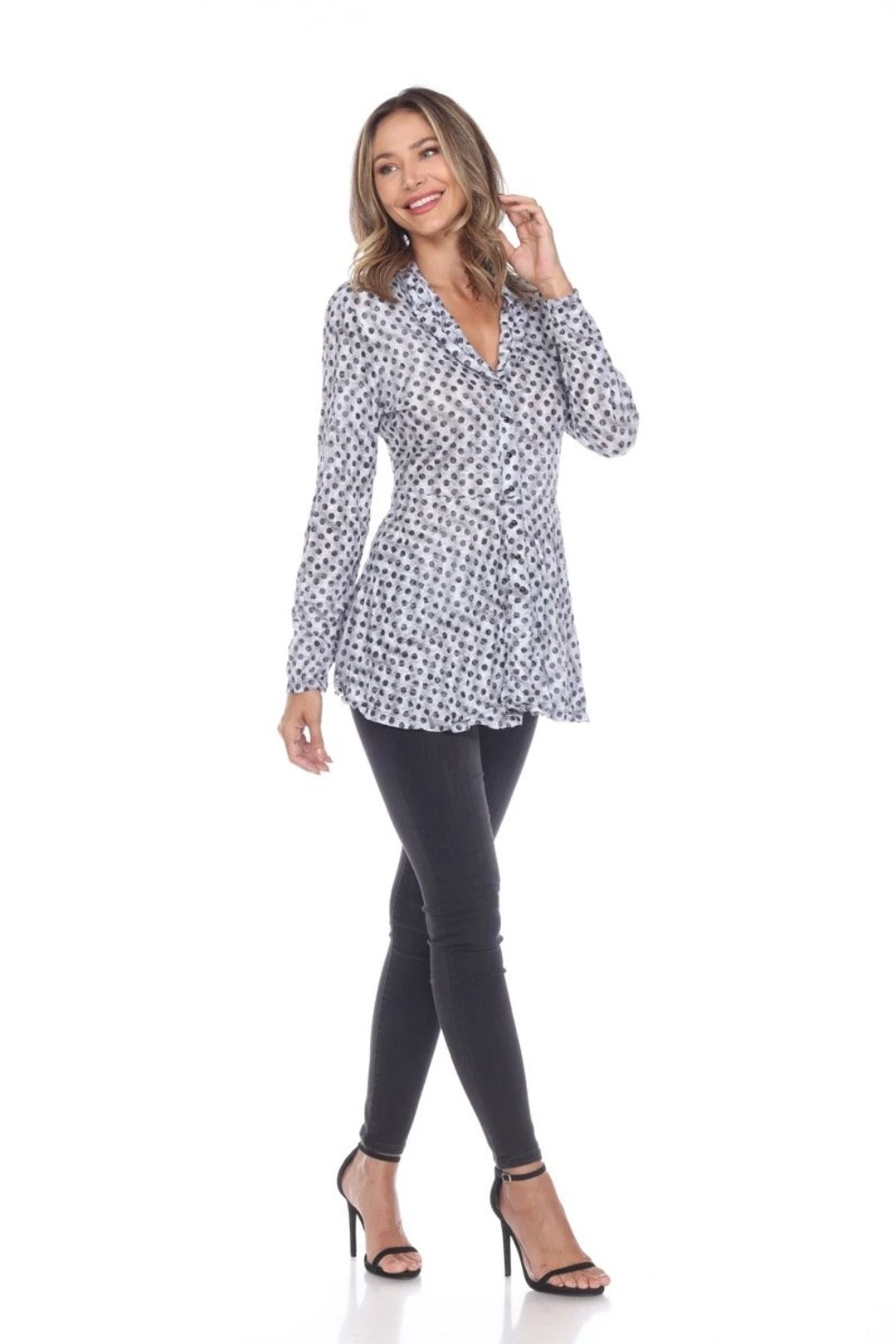 The Sadie Top features a figure flattering tunic body with shawl collar, full length sleeves and snap button front closure. Fashionable and casual top with a fit and flare silhouette, empire waist with a flowing peplum hem.Â