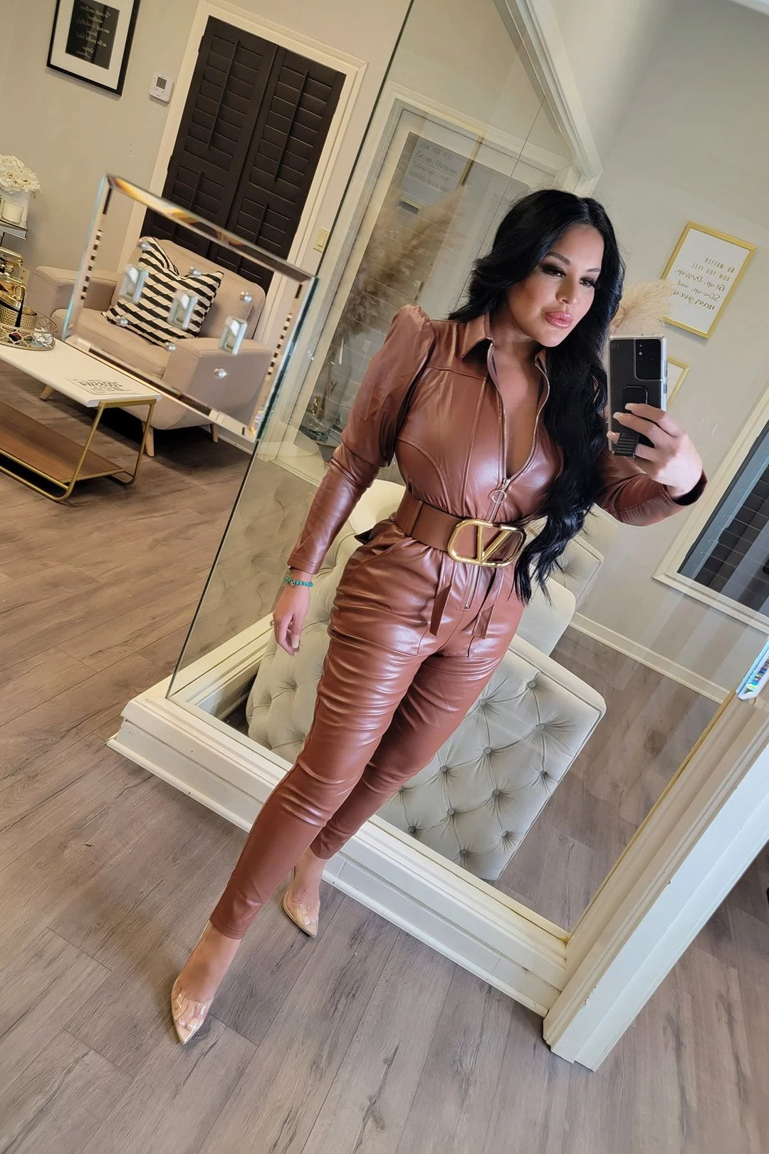 SALMA FAUX LEATHER JUMPSUIT IN CHESTNUT