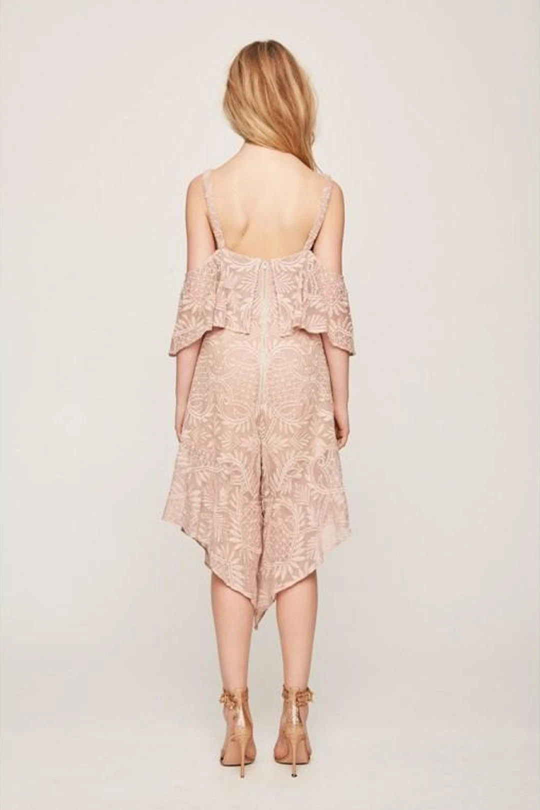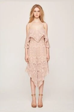 Once Was Santiago Waterfall Jumpsuit is a relaxed fit mid length jumpsuit in a blush lace material with an off the shoulder look and bra friendly straps. NOW 70% OFF! CLEARANCE SALE!