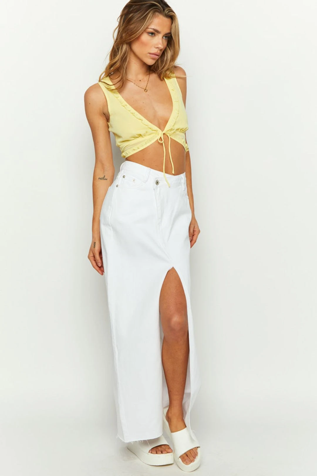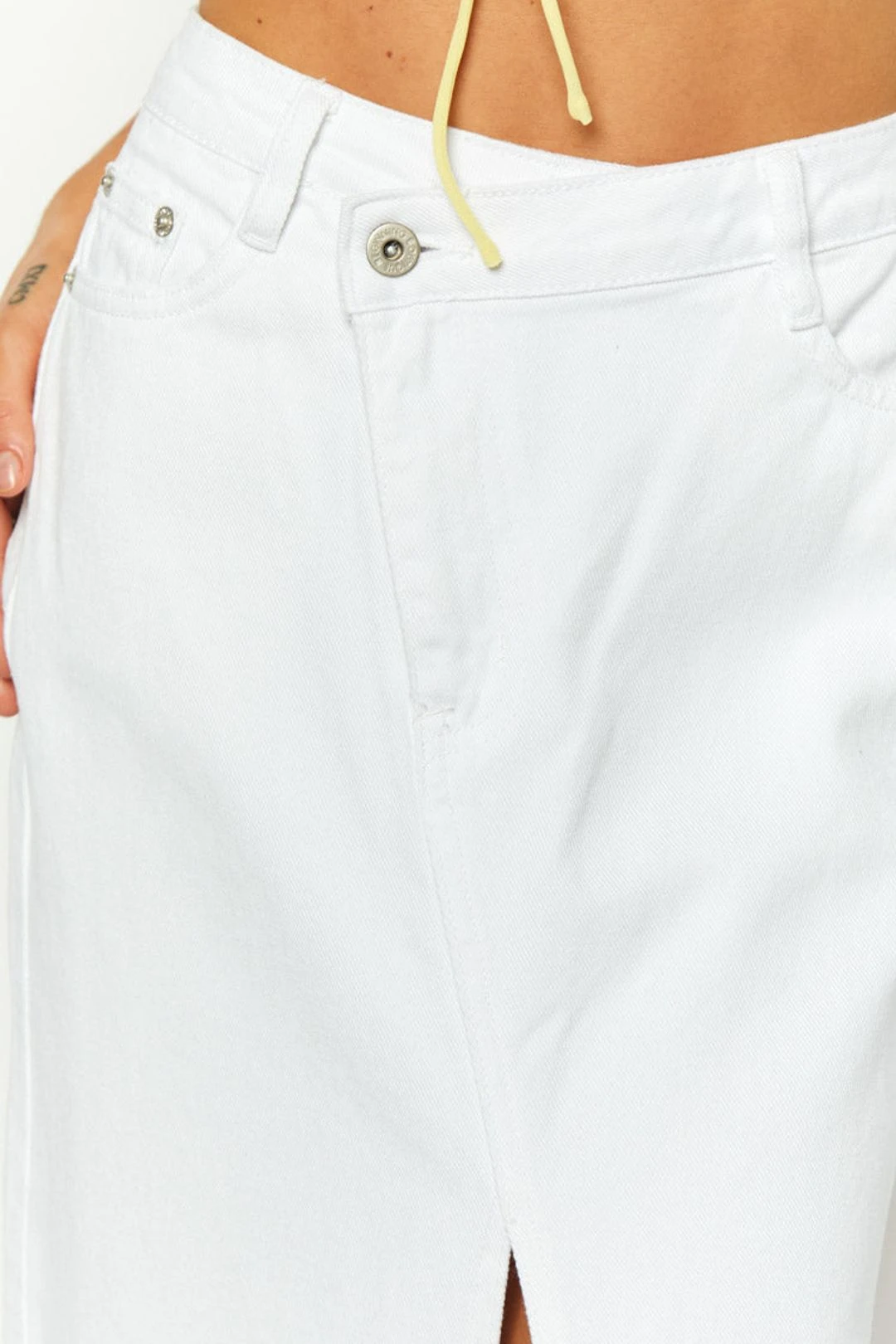 - Everyone needs a white denim skirt in their wardrobe! We’re in love with the uneven waist andย centerย split on this maxi skirt. This basic can be worn in any season, pairing perfectly with bright crop tops and cozy knits.