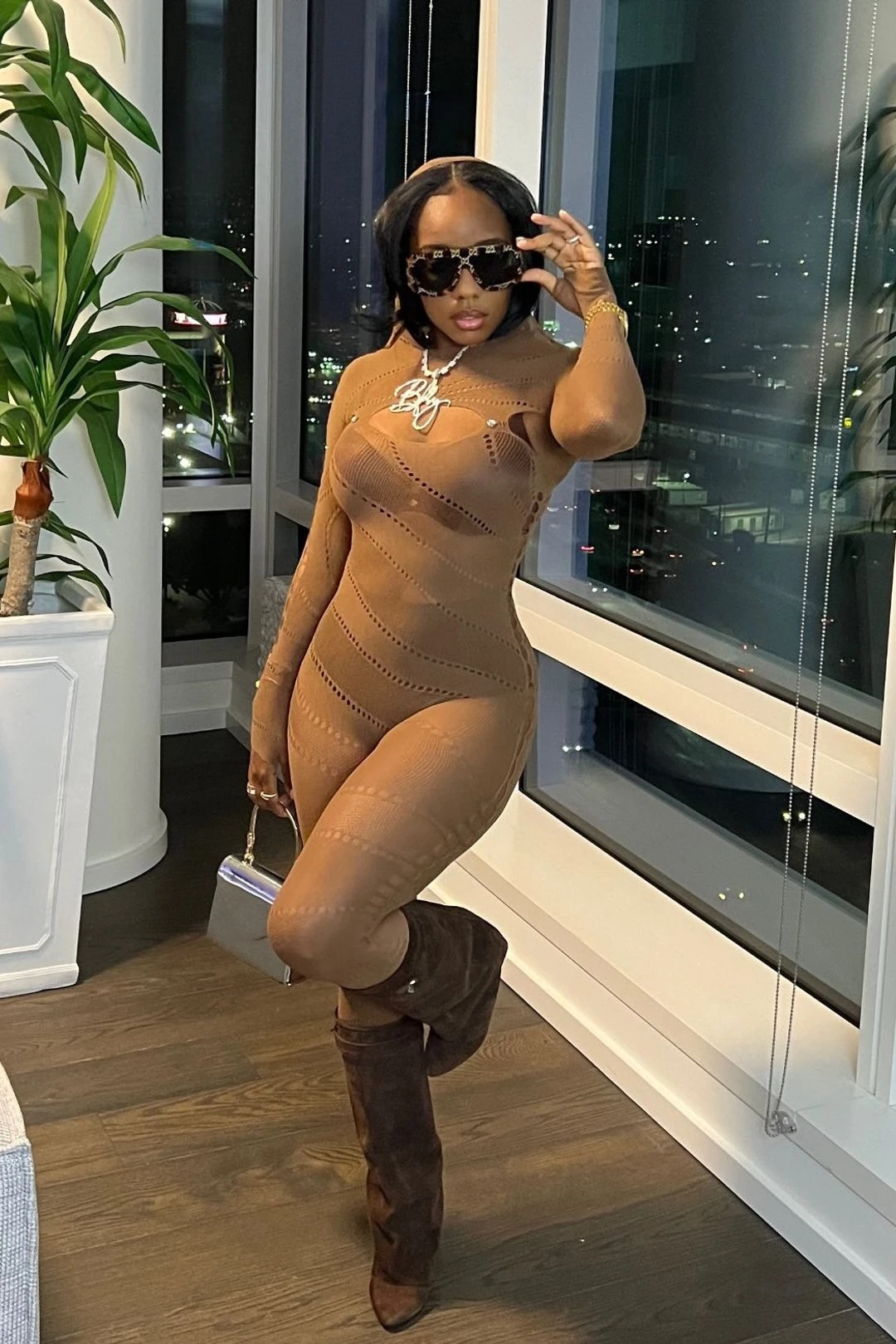 - Black & Brown Sheer Mesh Long Sleeve Hooded Jumpsuit