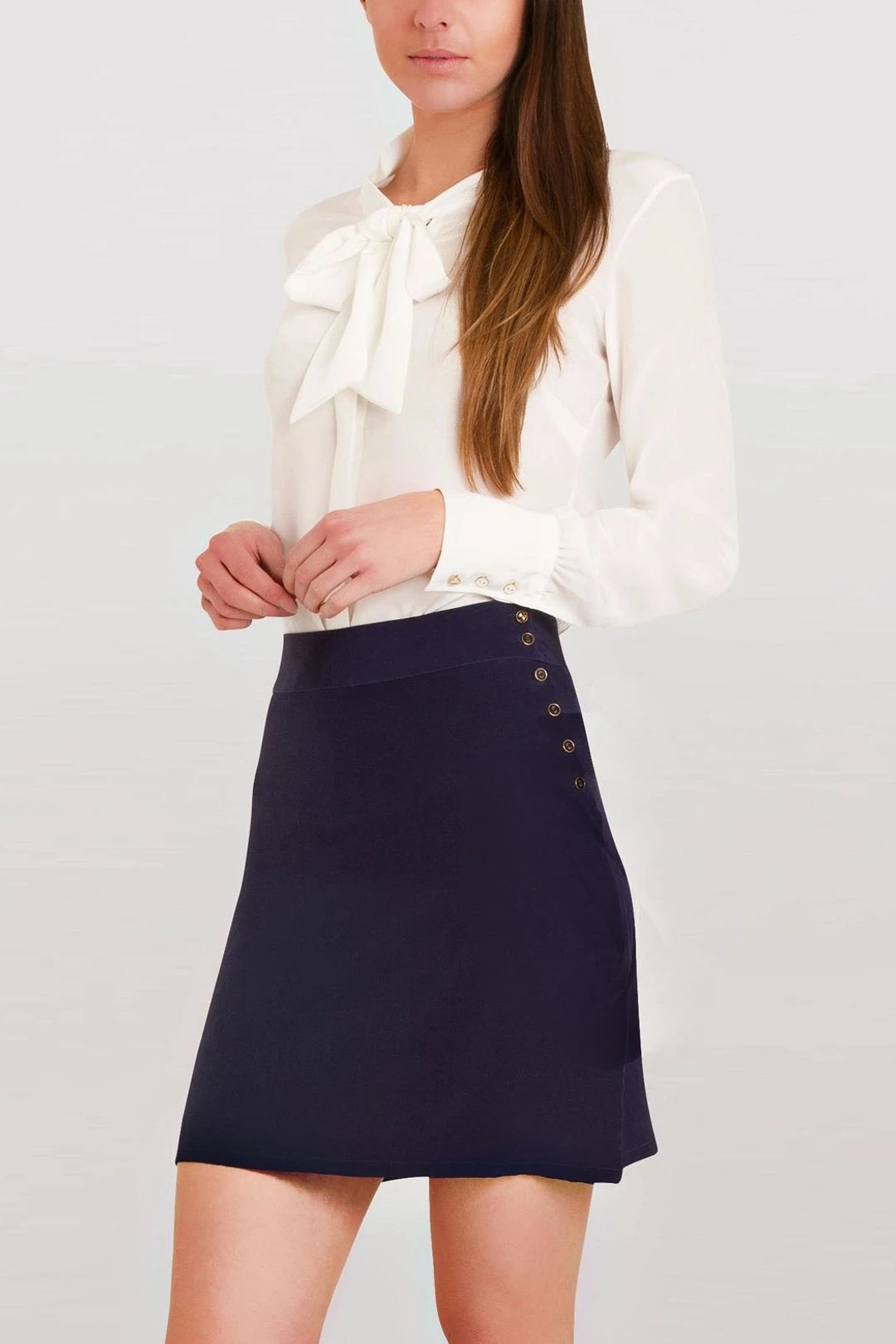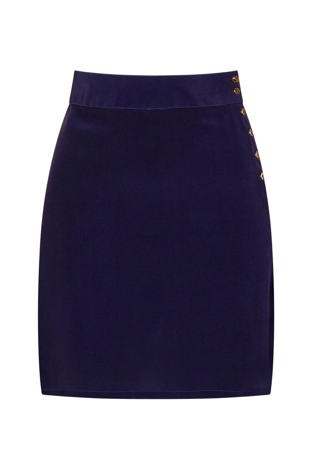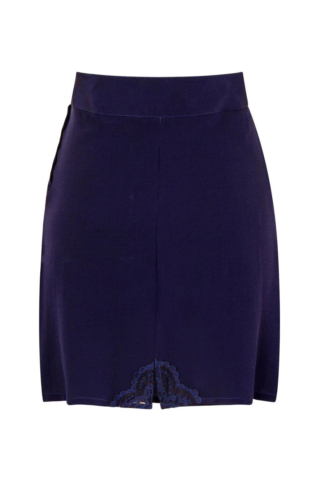 Tailored silk mini skirt in a beautiful Navy Blue. Fastened with custom-made gold-edge buttons on the side seam. Tailored waistband with cherry blossom print lining. Lace detailing at the back vent.