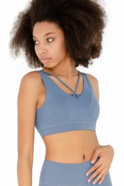 Ultimate style booster. Our new Sky Blue bra will be a standout item in your closet. This sports bra features a flattering strappy design in front and back with removable cups for an optional comfy fit. Providing great coverage and enough support, it is designed in a feminine silhouette. Cut from high-quality, ultra soft, stretchy fabric, this active top hugs the body and allows breathable all-day wear. Rock it for pilates, yoga, HIIT and other sweat sessions.