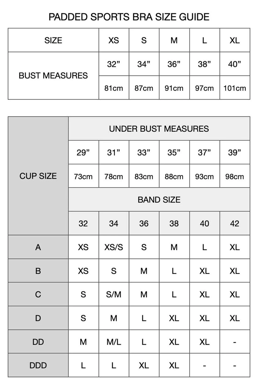 To be confident, please check below the specific size guide for the padded sports bras