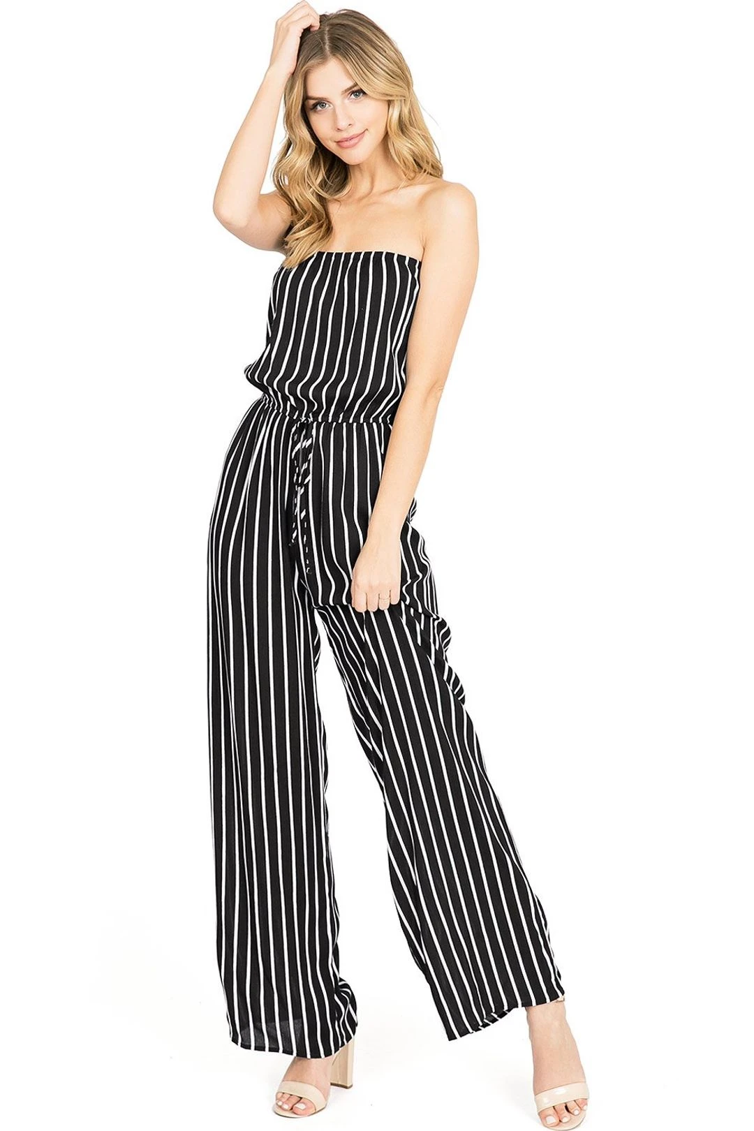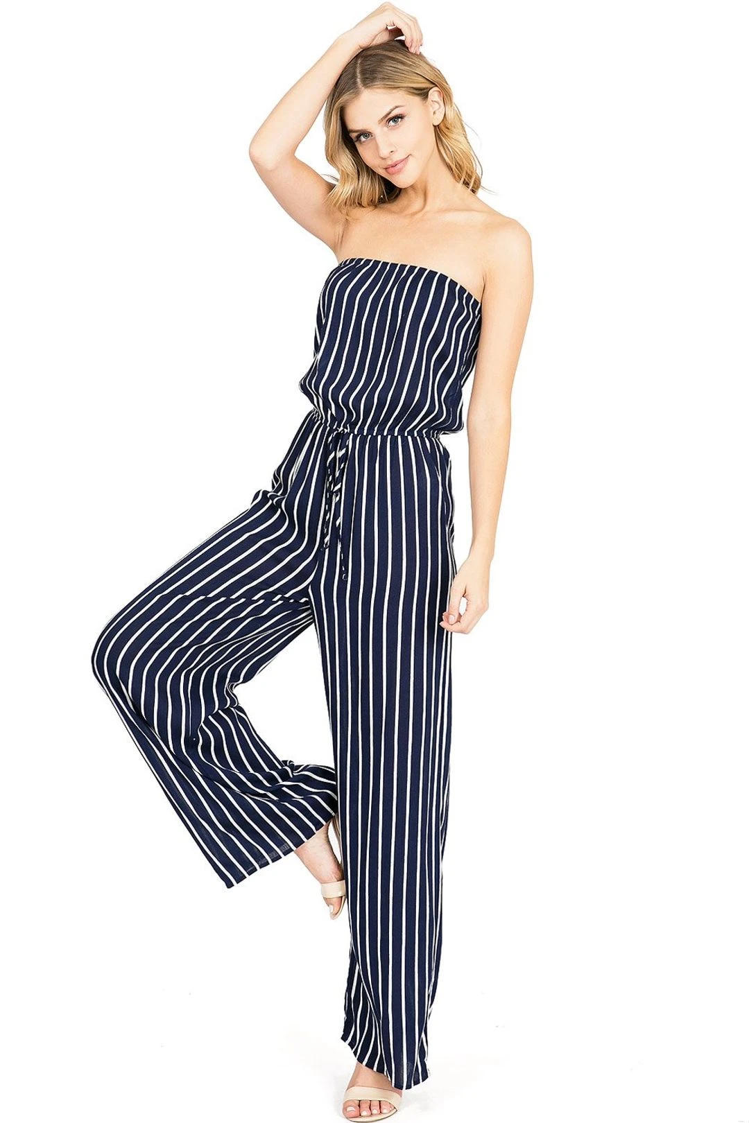 Striped nautical jumpsuit with a tube top fit, an elasticized waist and wide leg bottoms. Stretchy elastic fitting across the top for a secure fit. Light woven fabric, great for any casual Summer occasion!