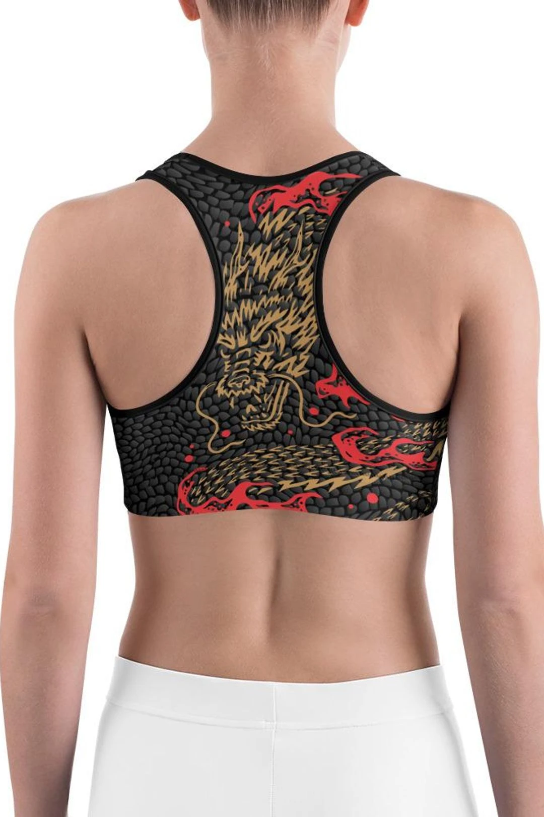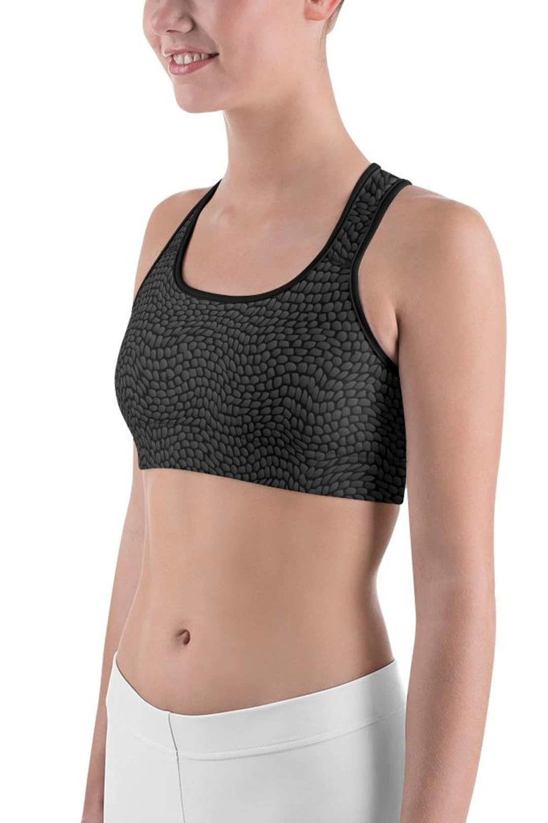 This gorgeous sports bra is made from moisture-wicking material that stays dry during low and medium intensity workouts. The bra has support material in the shoulder straps, double layer front, and a wide elastic band to ensure constant support.