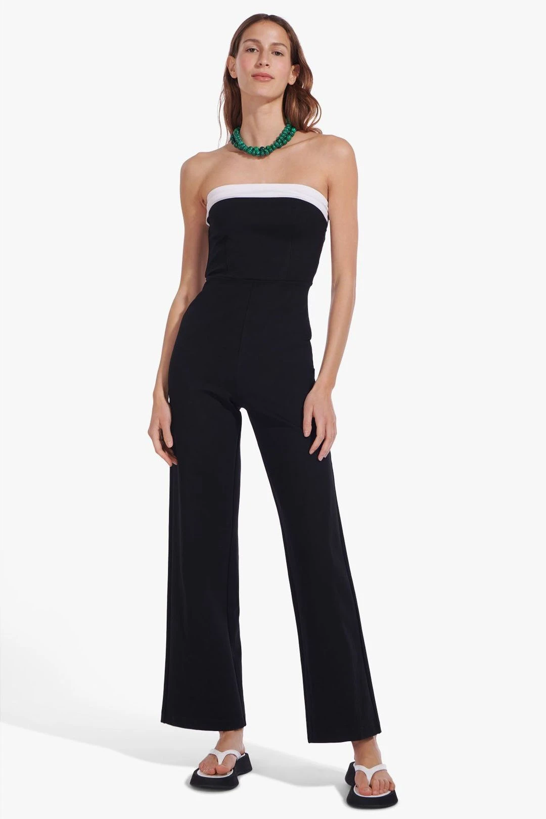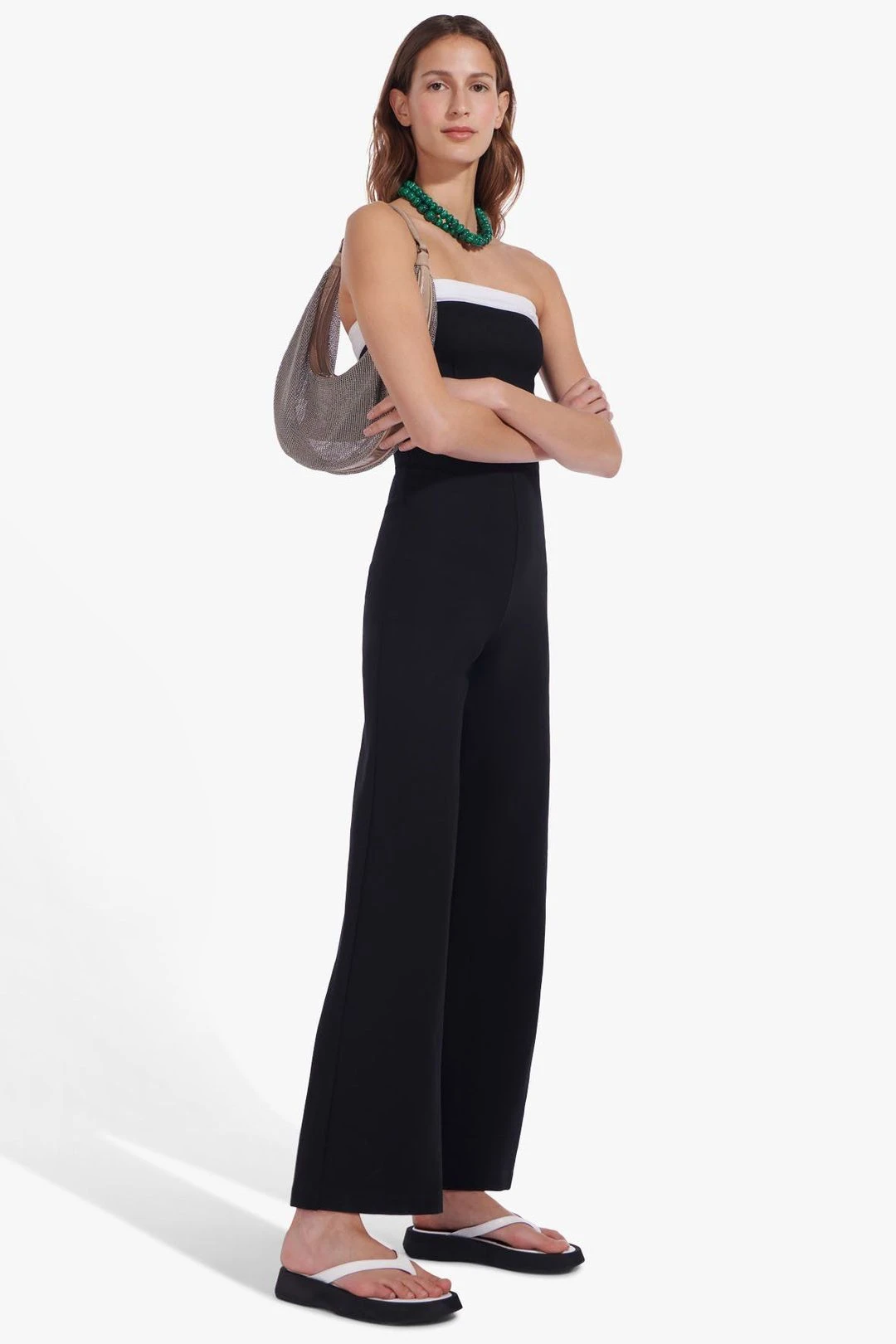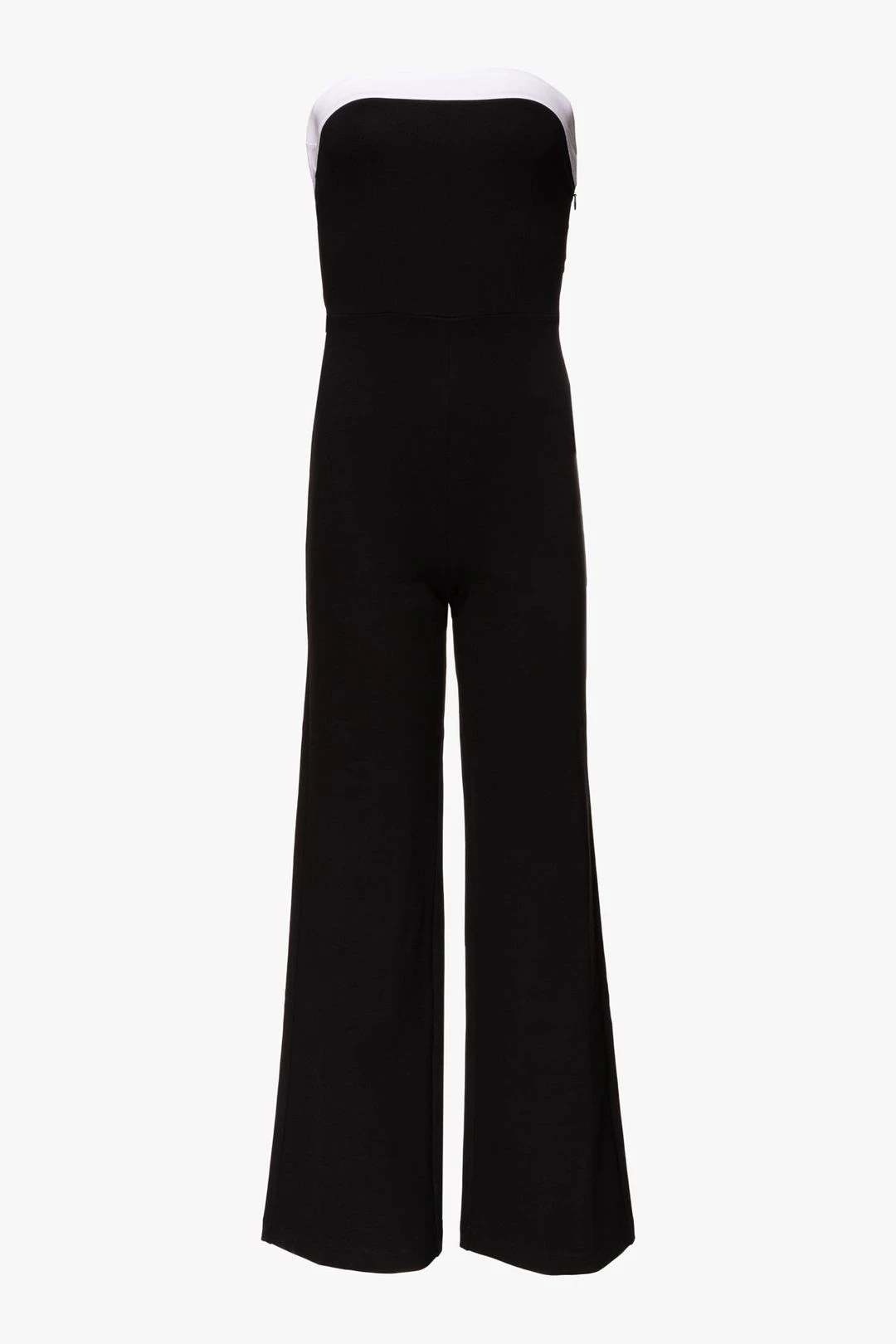 The Rizzoli is a strapless ponte jumpsuit with a contrast panel at the chest and a fitted bodice. This piece features a mesh back panel detail and a side zipper.