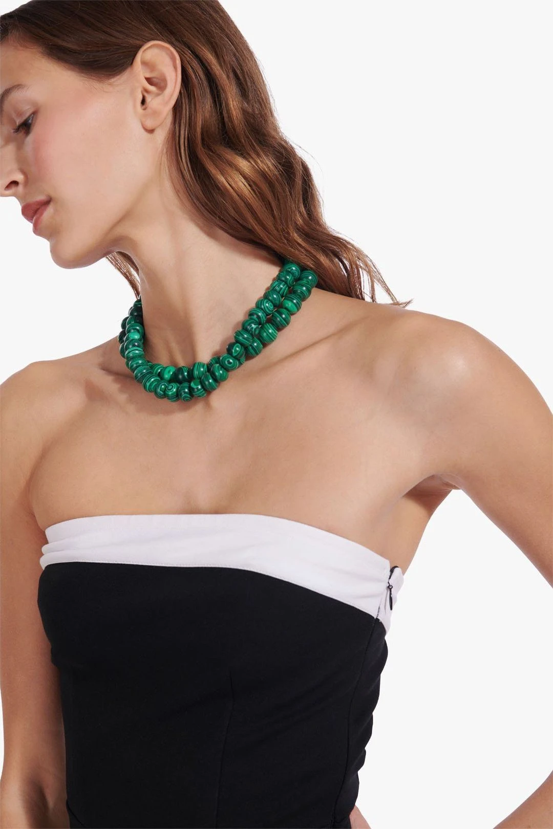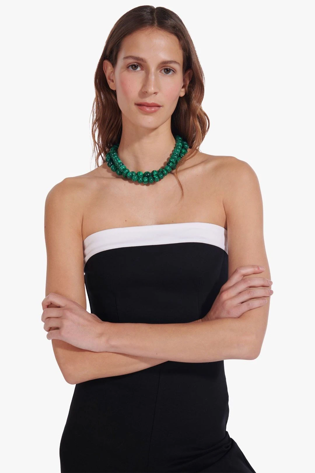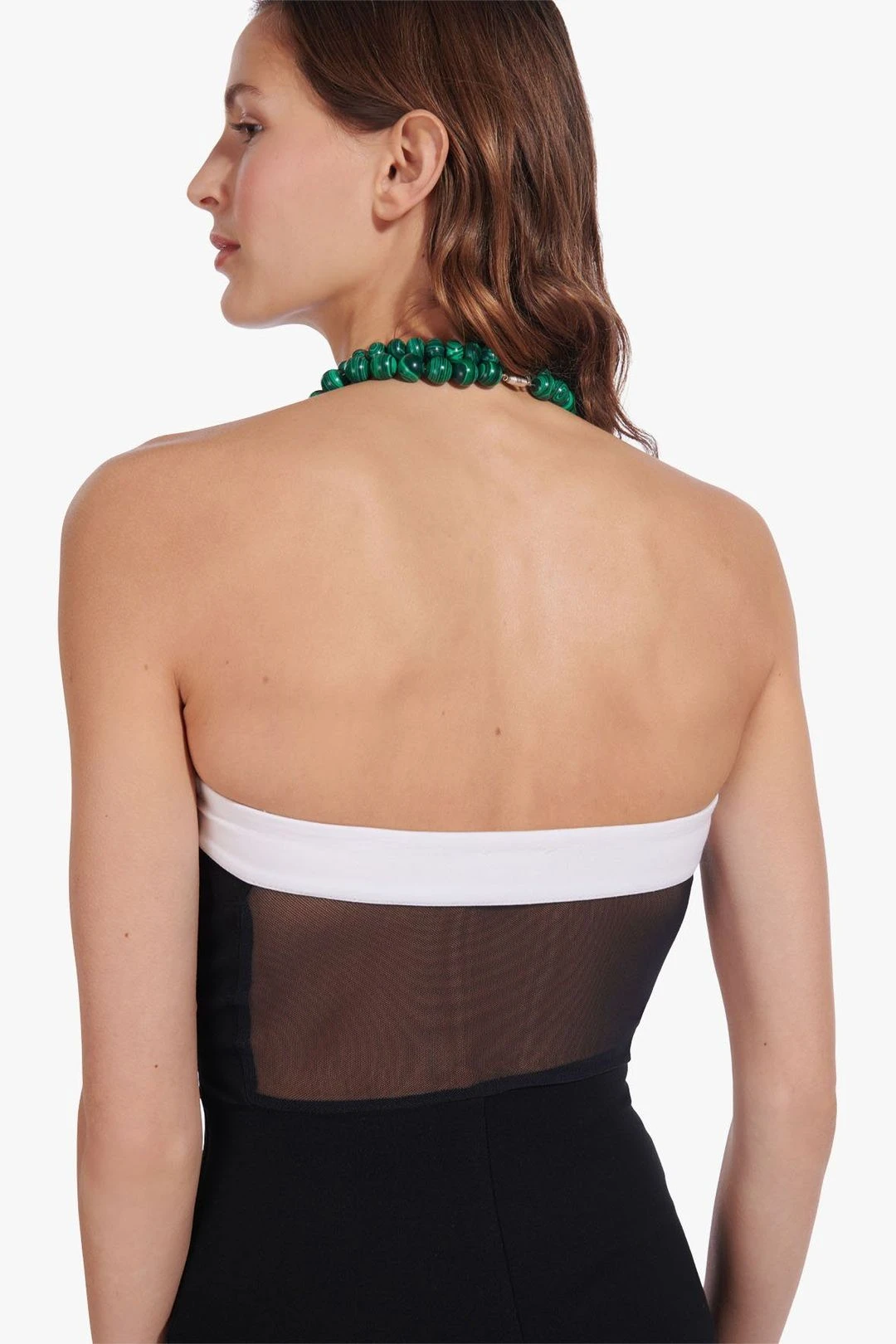 The Rizzoli is a strapless ponte jumpsuit with a contrast panel at the chest and a fitted bodice. This piece features a mesh back panel detail and a side zipper.