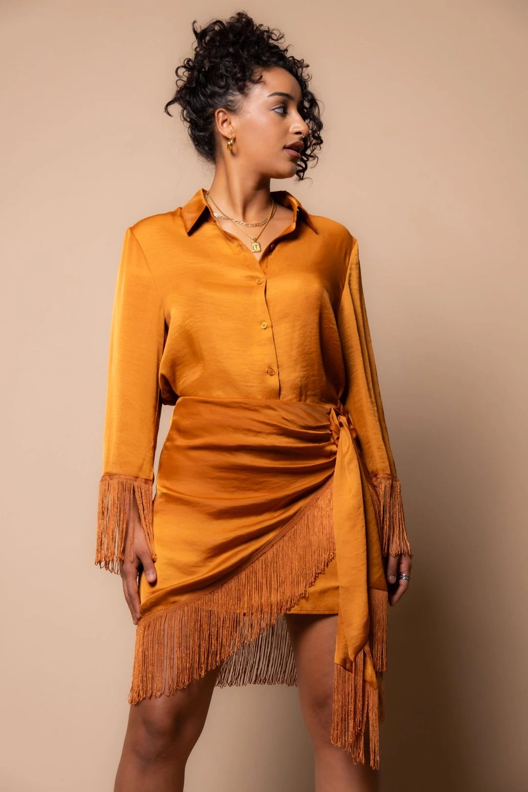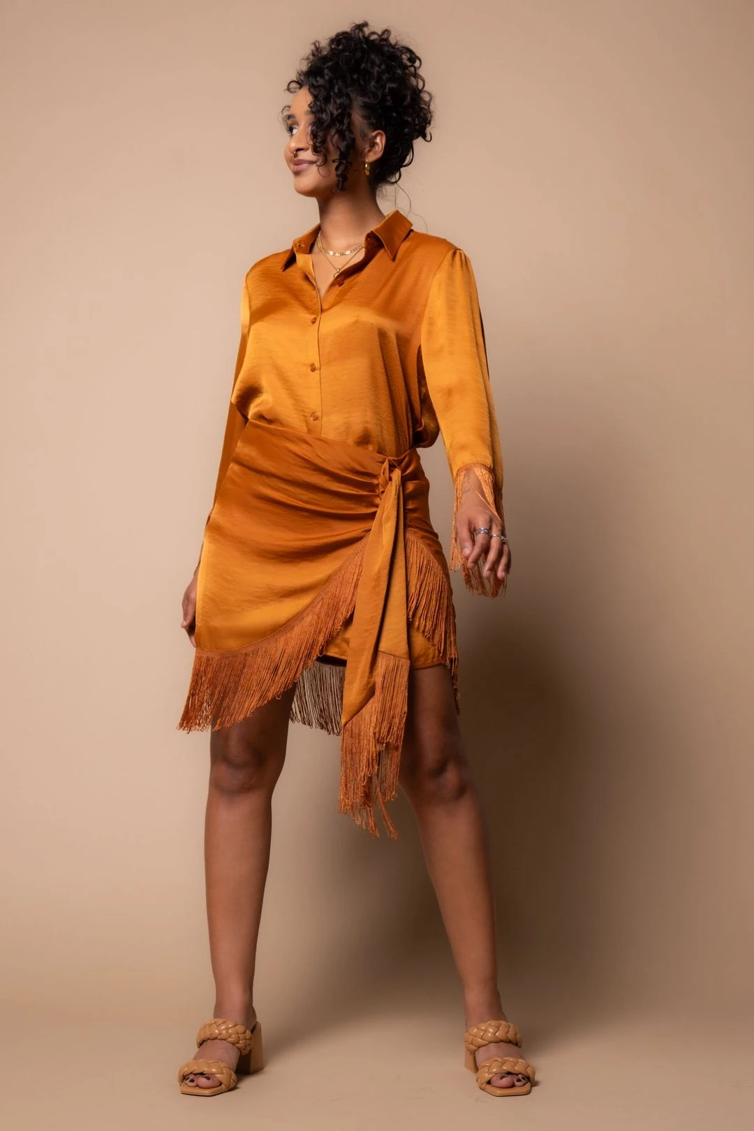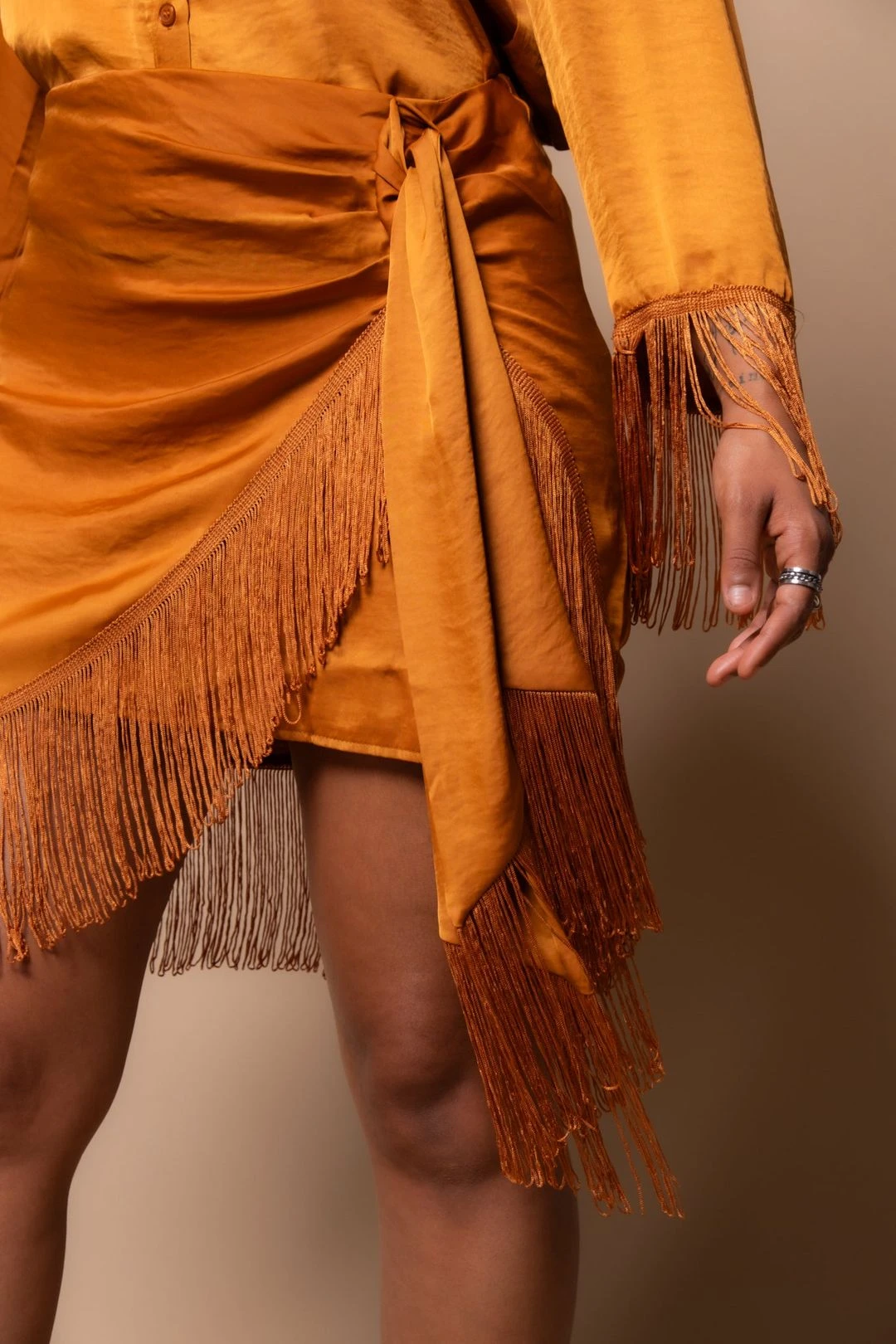 Elevate your style game with the Steve Madden Inessa Fringe Skirt! This wrap-style skirt in a rich caramel hue exudes boho-chic vibes, while the fringe trim adds a playful touch of movement. Style it with a sleek black bodysuit or complete the coord look with the matching Sofee Fringe Top!