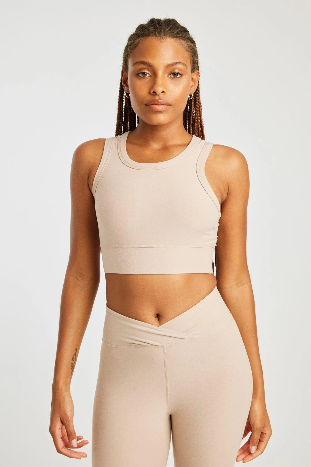 A cropped length with an athletic tank silhouette, the Stretch Bra is casual and sporty all the way. Interior lining in front of bra with a double-layered bottom band for control along the waist. ¾” binding along neckline and armhole. Made with Active Stretch Jersey.
