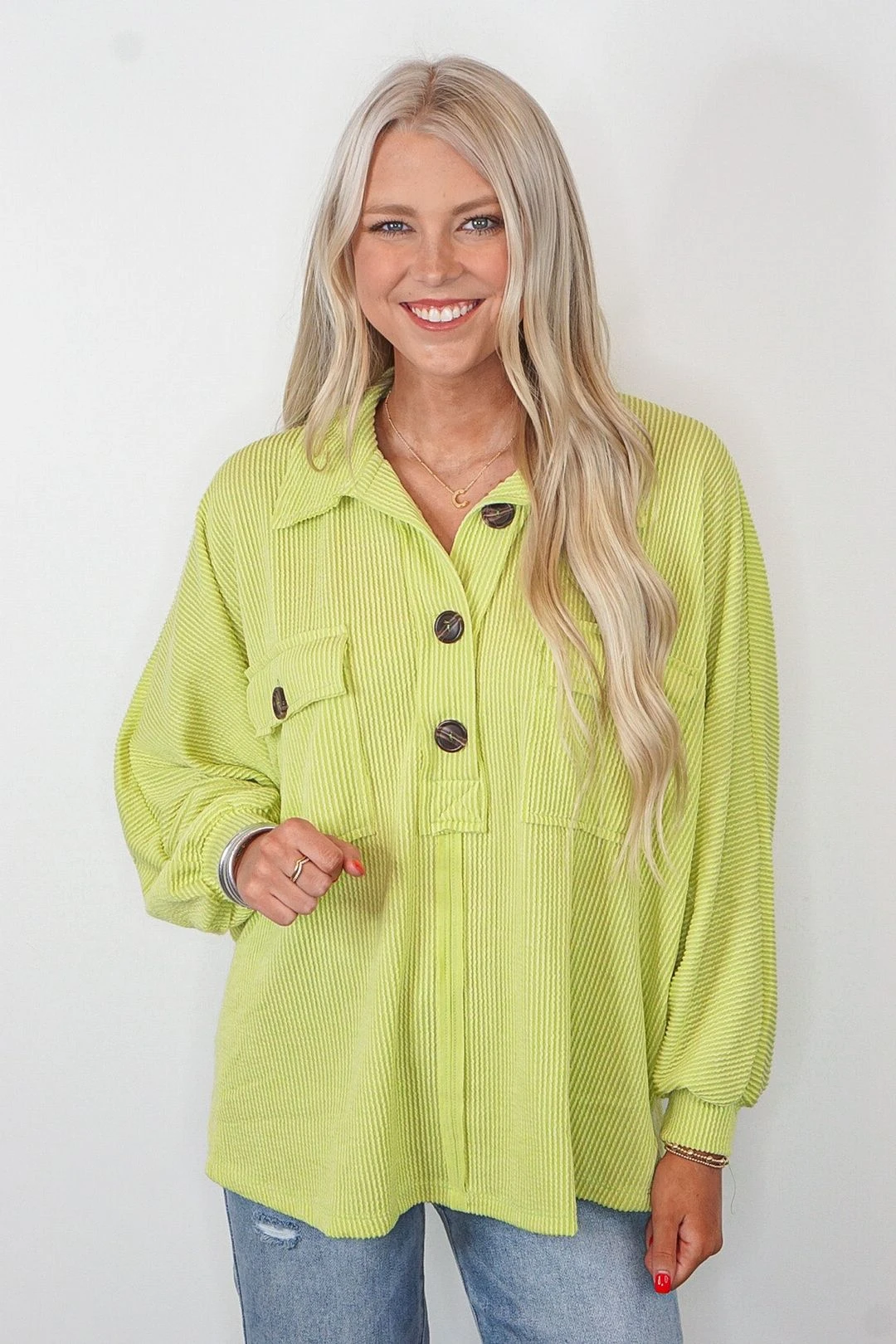 This Sweet Simplicity Lime Ribbed Top is perfect for adding a little “rib-dorable” style to your wardrobe! Constructed from a soft ribbed fabric, she features a collar and button henley neckline, two button front chest pockets and cuffed long dolman sleeves for a look that’s as comfy as it is stylish. She’ll have you ready to take on the day! Perfect with denim & sneakers!