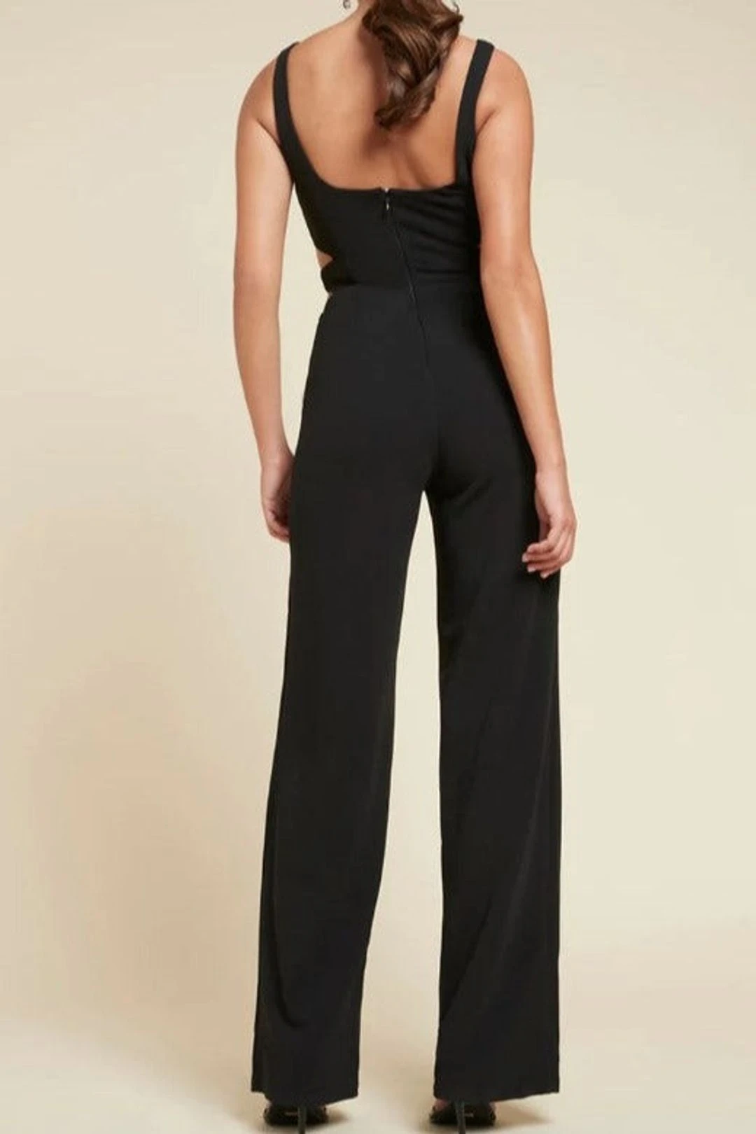 Our Tegan Jumpsuit features a full length, sleeveless, sweetheart neckline, wide straps, cutouts on the waist and invisible zipper.