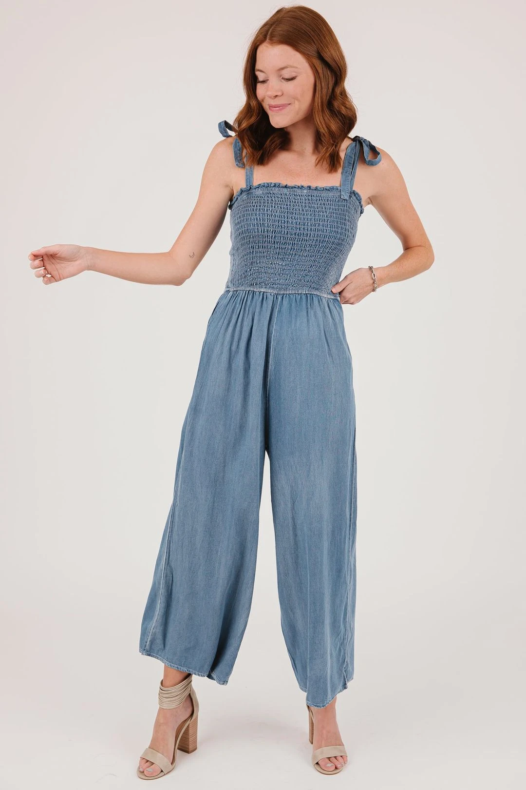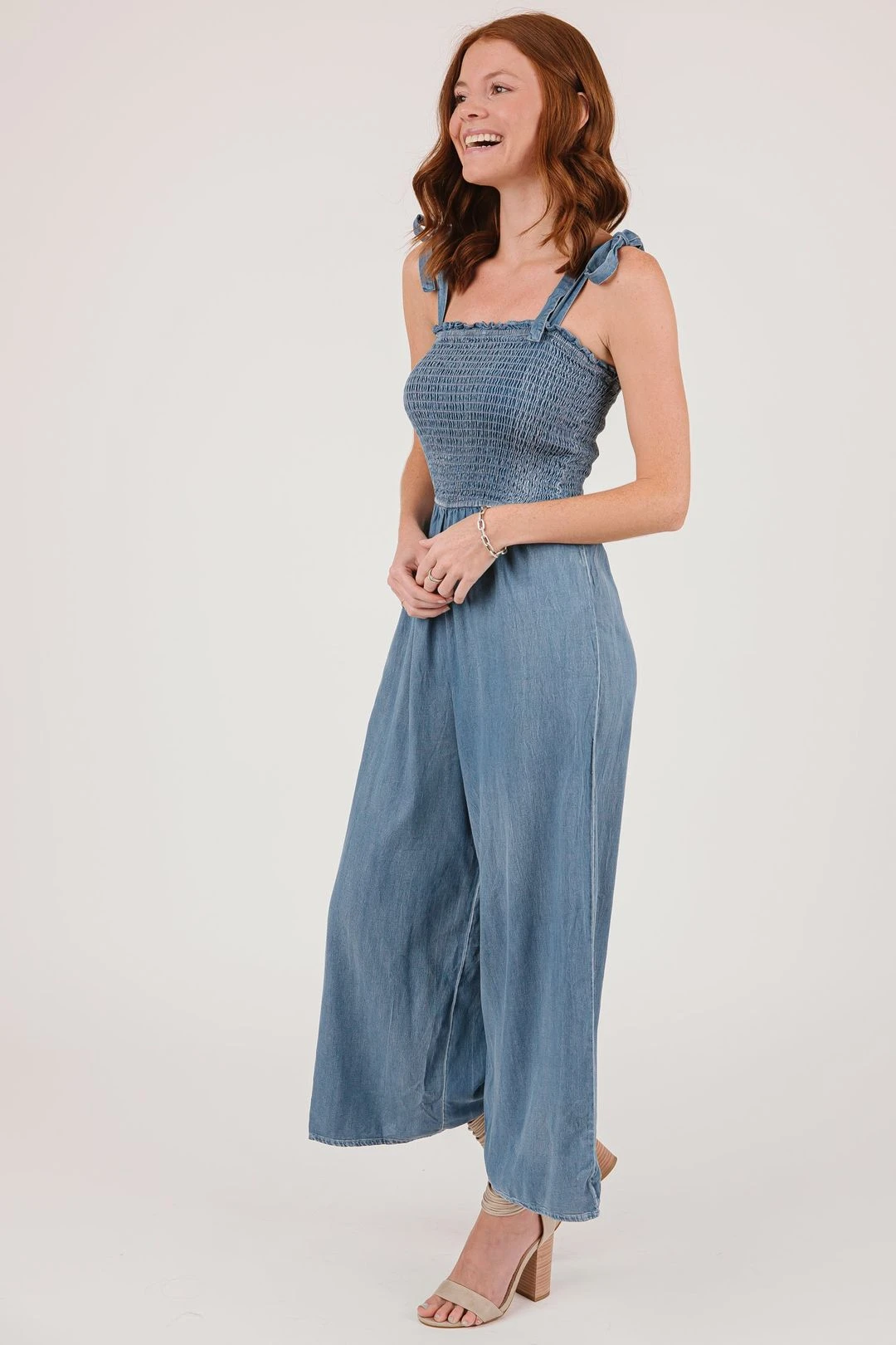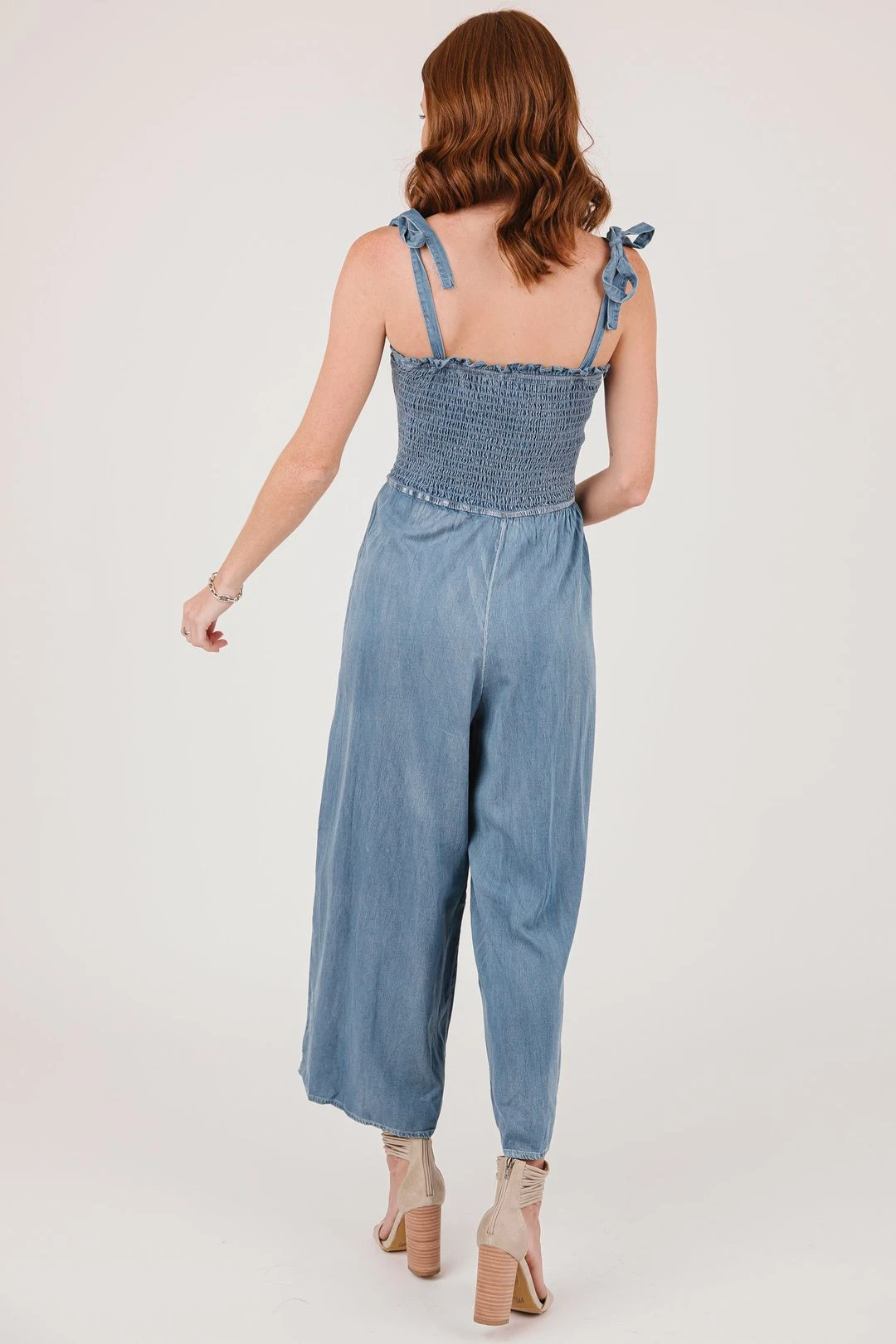 Take denim to the next level with our Tell Your Friends Jumpsuit! From the fit to the versatility – this jumpsuit with take you through all seasons! Detailed with adjustable tie straps & a smocked body.Â