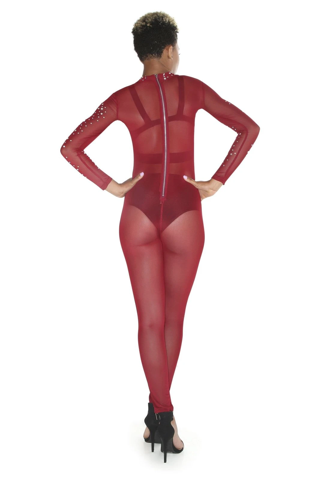 Show up in sheer beauty with this dazzling, skin-bearing jumpsuit. Thalia exemplifies Hollywood glam and is indeed a confident statement piece. This jumpsuit is composed of premium, stretchy mesh fabric, varnished in stunning gems, and finished with rear zip closure.Â