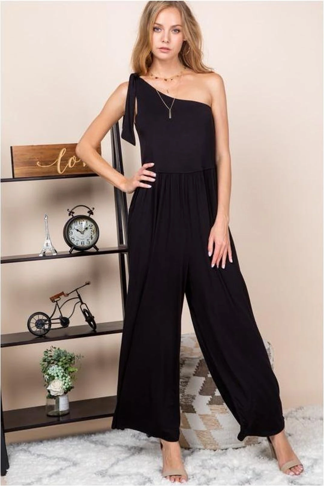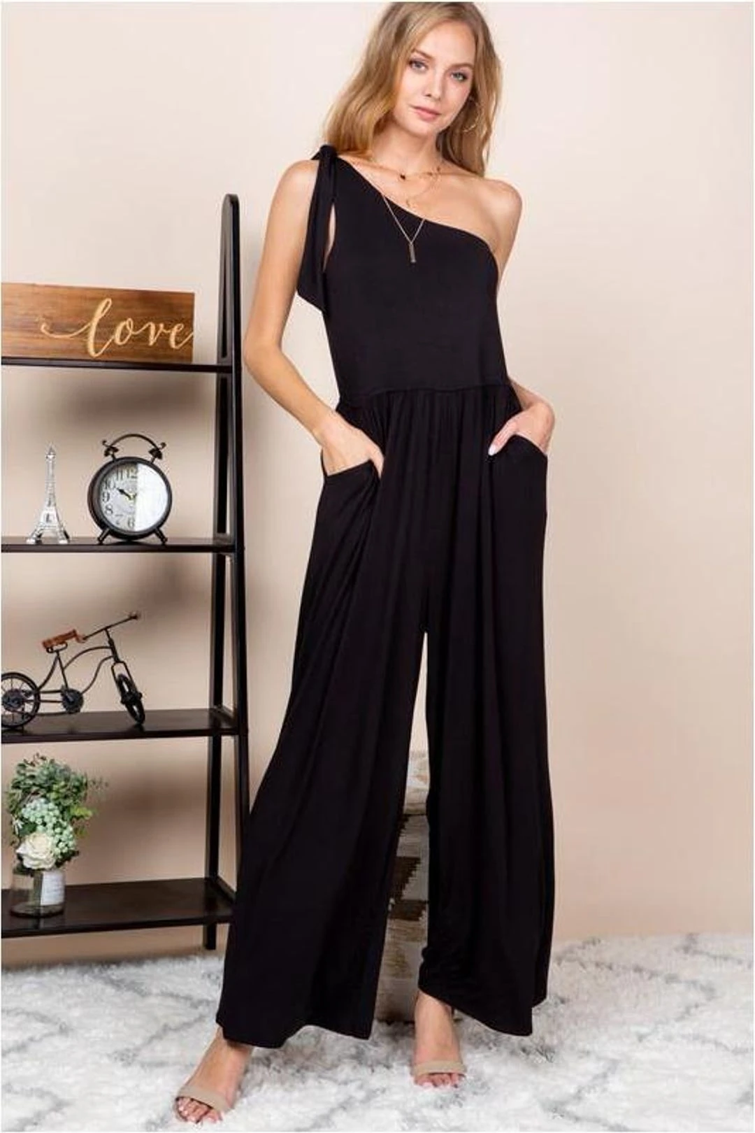 The Chantal Jumpsuit is a simple one shoulder bow, wide leg jumpsuit with side pockets. This is a perfect jumpsuit for dinner dates or for an elegant night out look. Pair this with a lightweight kimono and some simple jewelry.