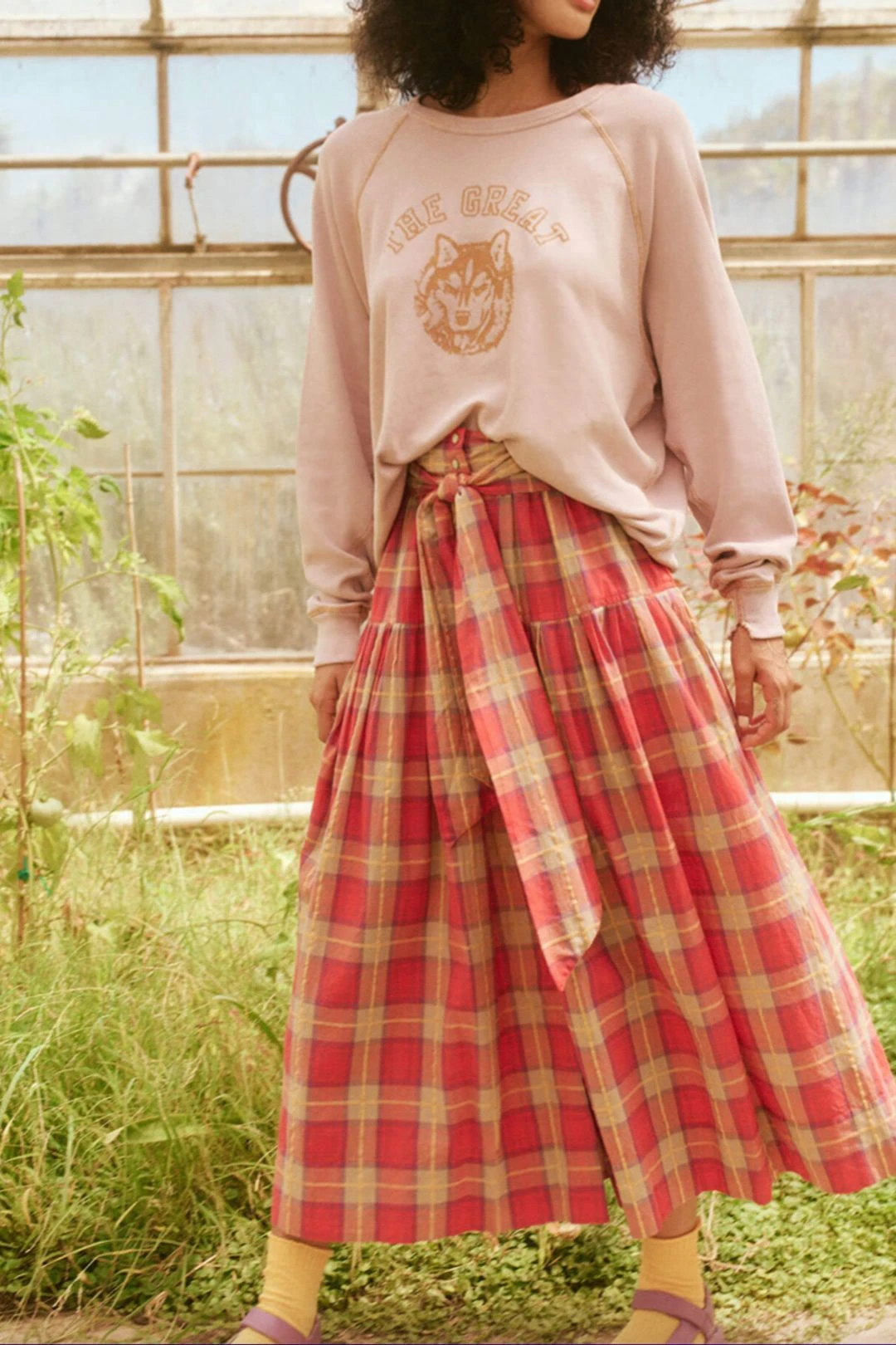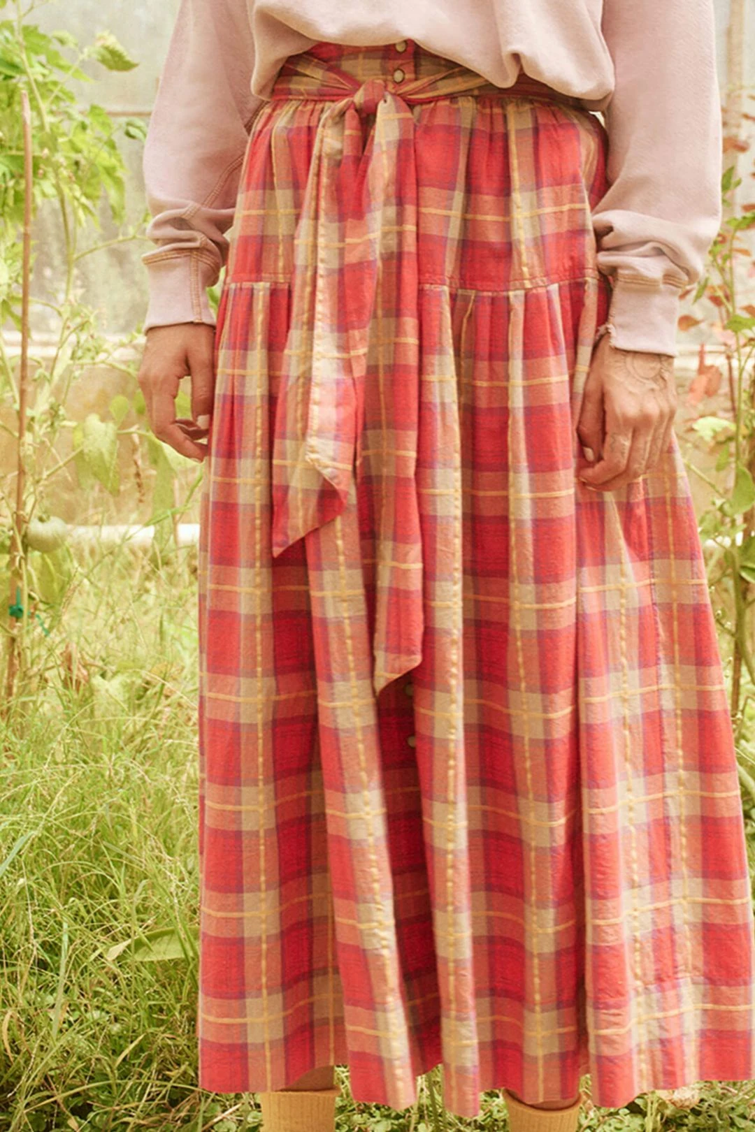 The Highland Skirt is cut  from  Spring’s Lake House Plaid . It brings gorgeous texture to this traditional shape. It has an elasticated waist for maximum comfort, a dropped waist seam, and an optional self-tie  sash with a  flowy hem  that  hits just above the ankle.