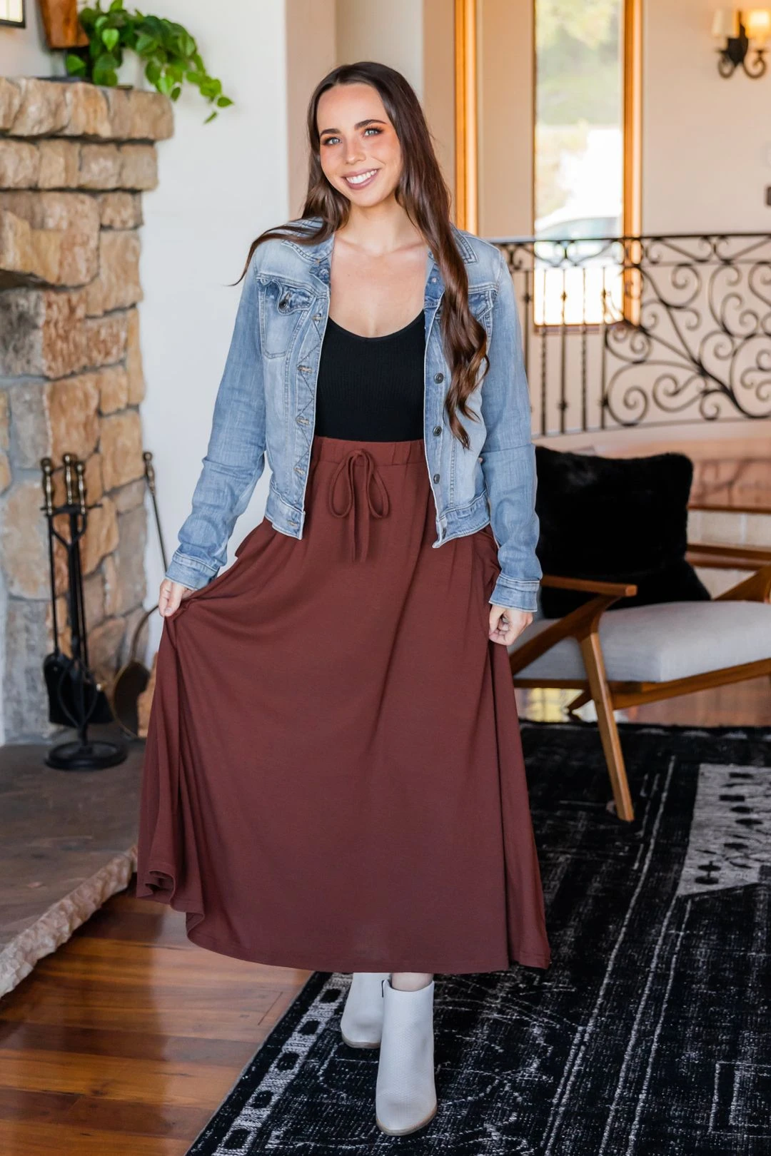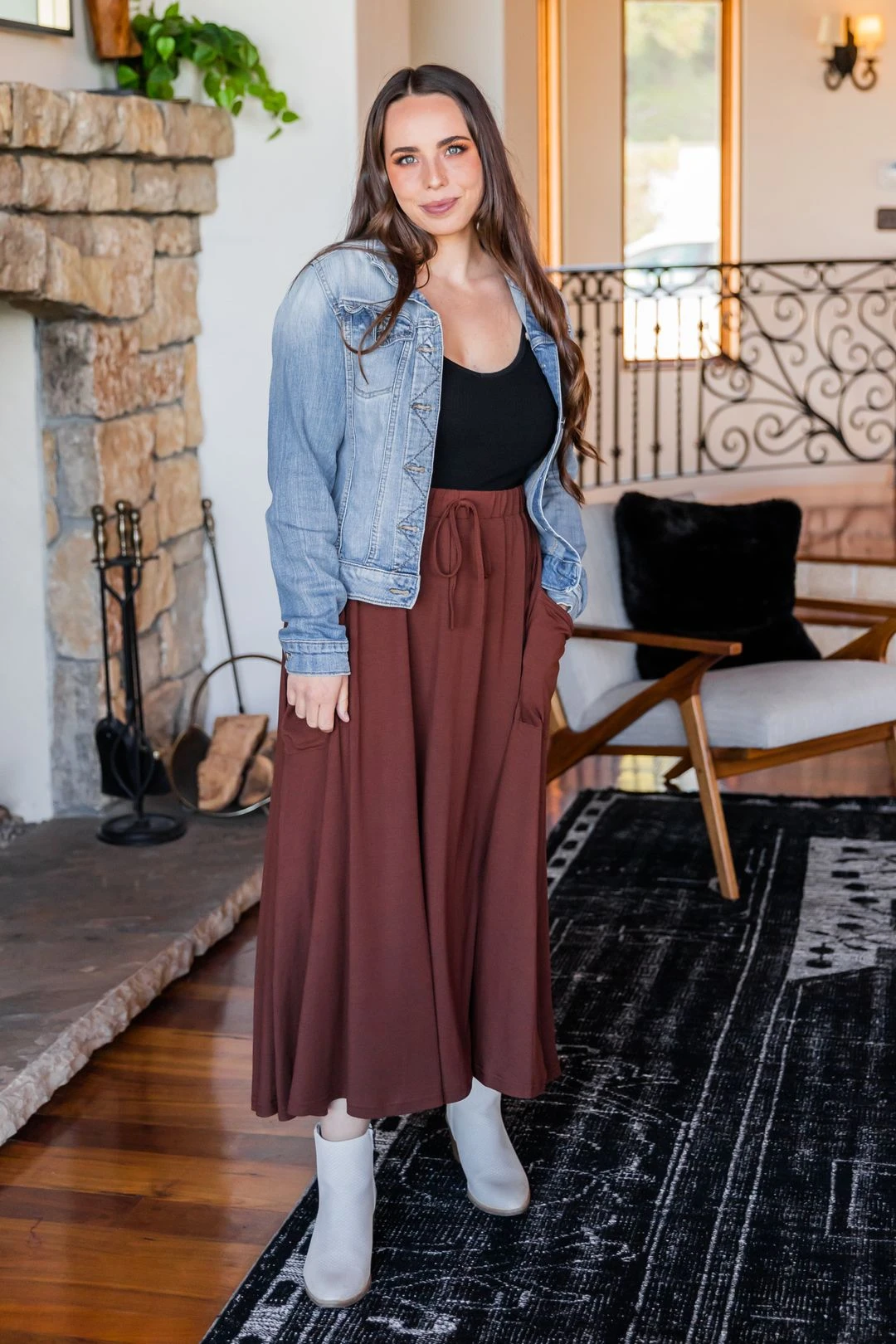 For those that need a little break from their jeans, our Olive pocket skirt is the perfect match! Its functional pockets on the side will hold the items you love most all while being comfy and trendy. Don’t forget the waist band that completes this skirt and contributes to that comfort factor!