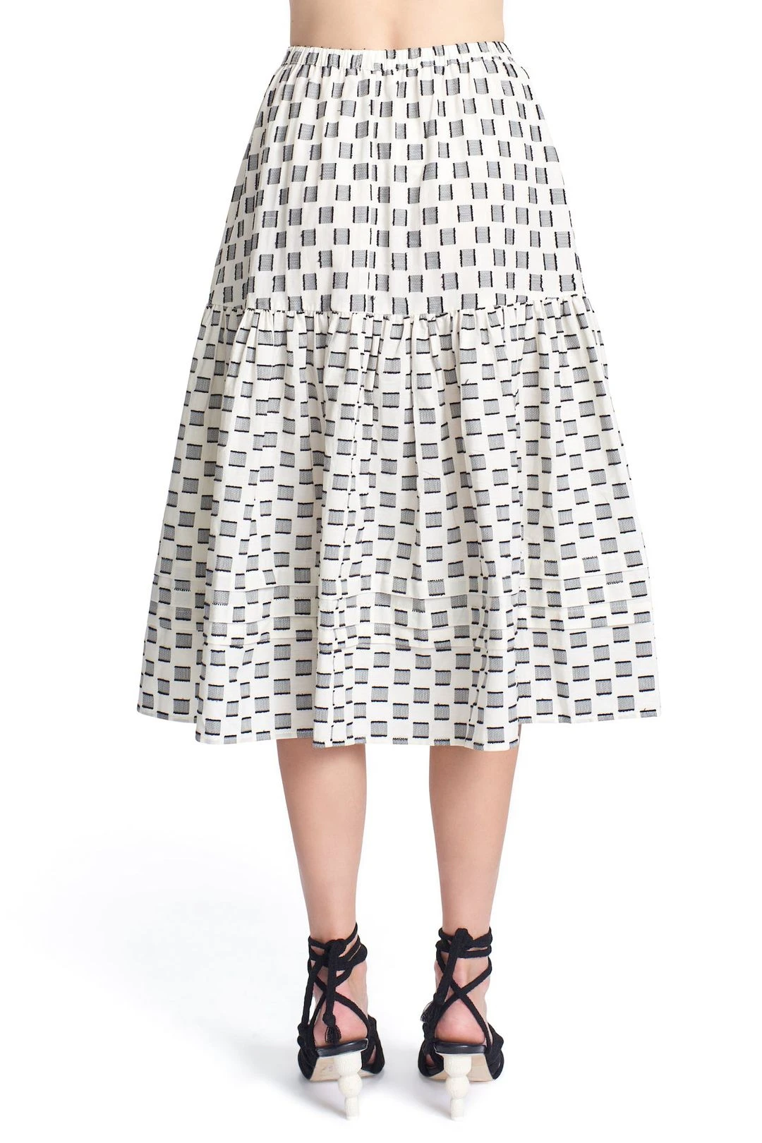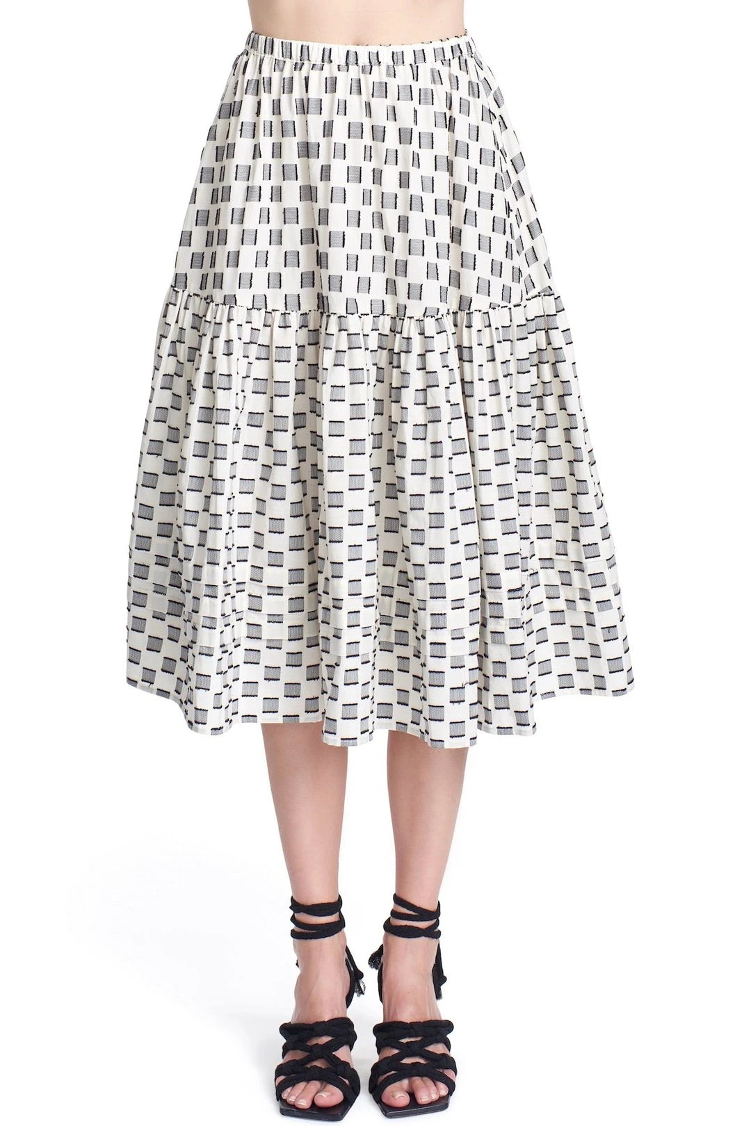 The Rina skirt is a pretty pull on midi shape. Its’ a swing style and has a ruffle tier. Shown here in our “Texture Block Jacquard”.Â