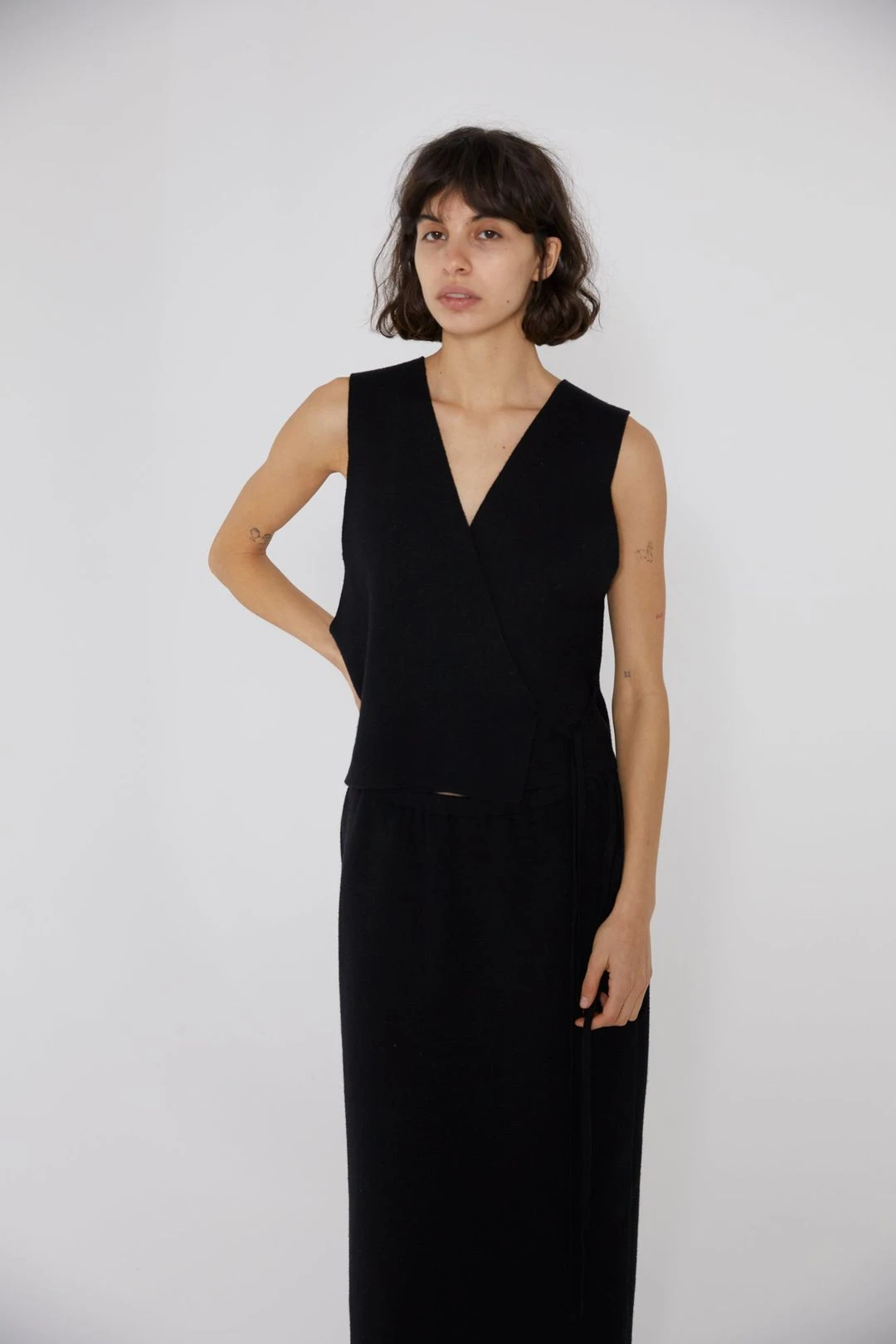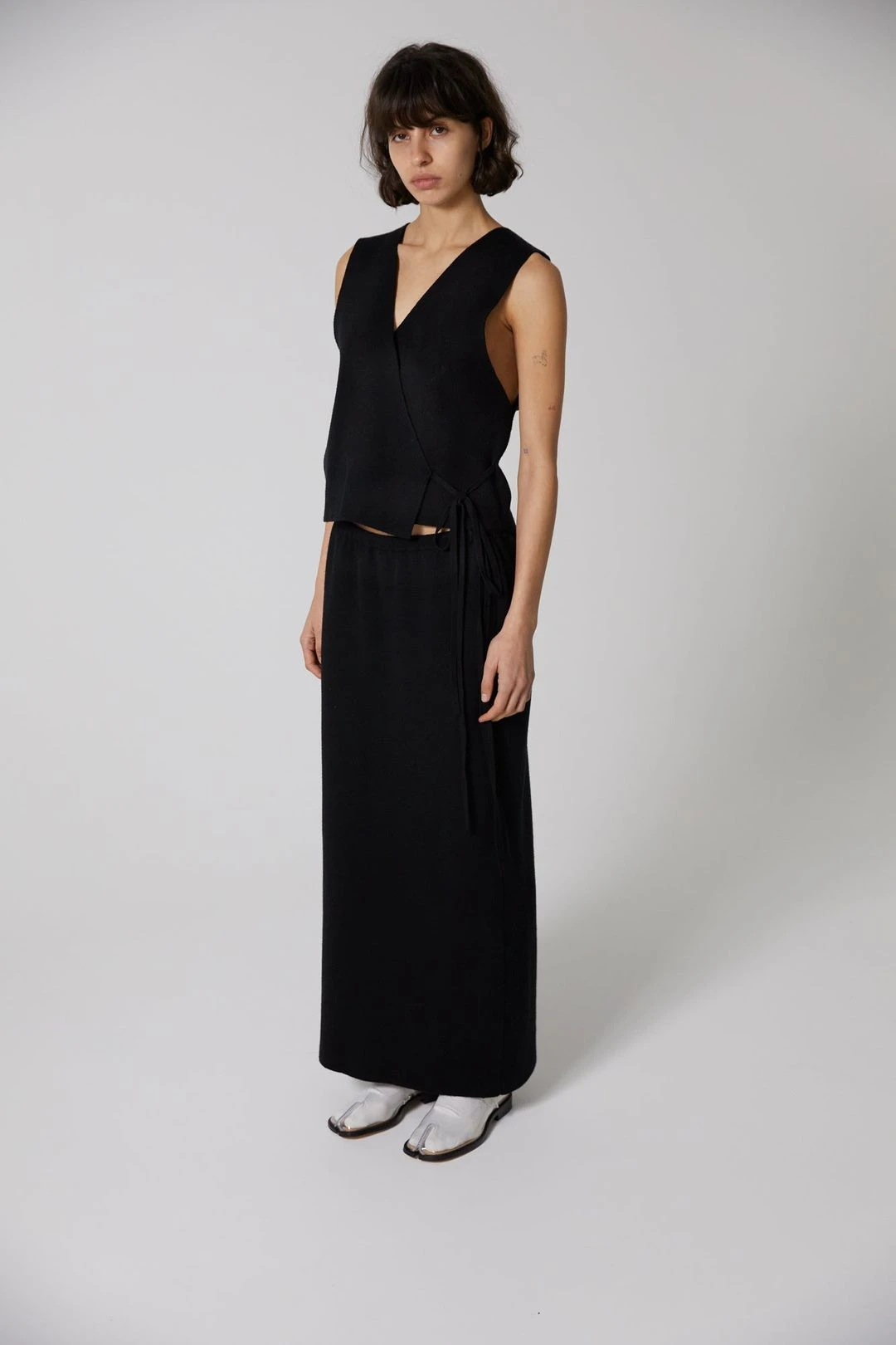 in a softly weighted and luxurious sustainable knit blend the skirt features a soft elastic waist with a self fabric drawcord to the side designed to fit mid-rise and relaxed in a full length