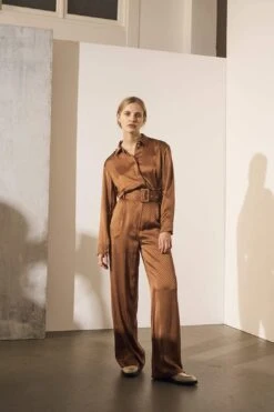 De Twist jumpsuit is gemaakt van een soepel vallende Italiaanse jacquard. De jumpsuit valt zacht en soepel om het lichaam, heeft een ceintuur welke een slanke taille creëert. Sluit de jumpsuit met gestoffeerde knoopjes. De broekspijp valt los om het lichaam