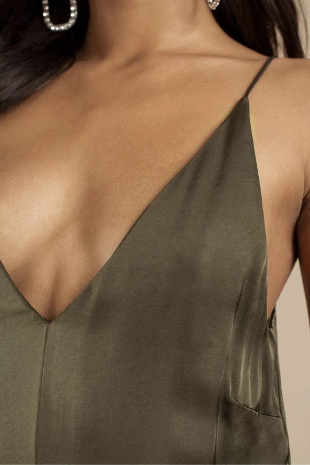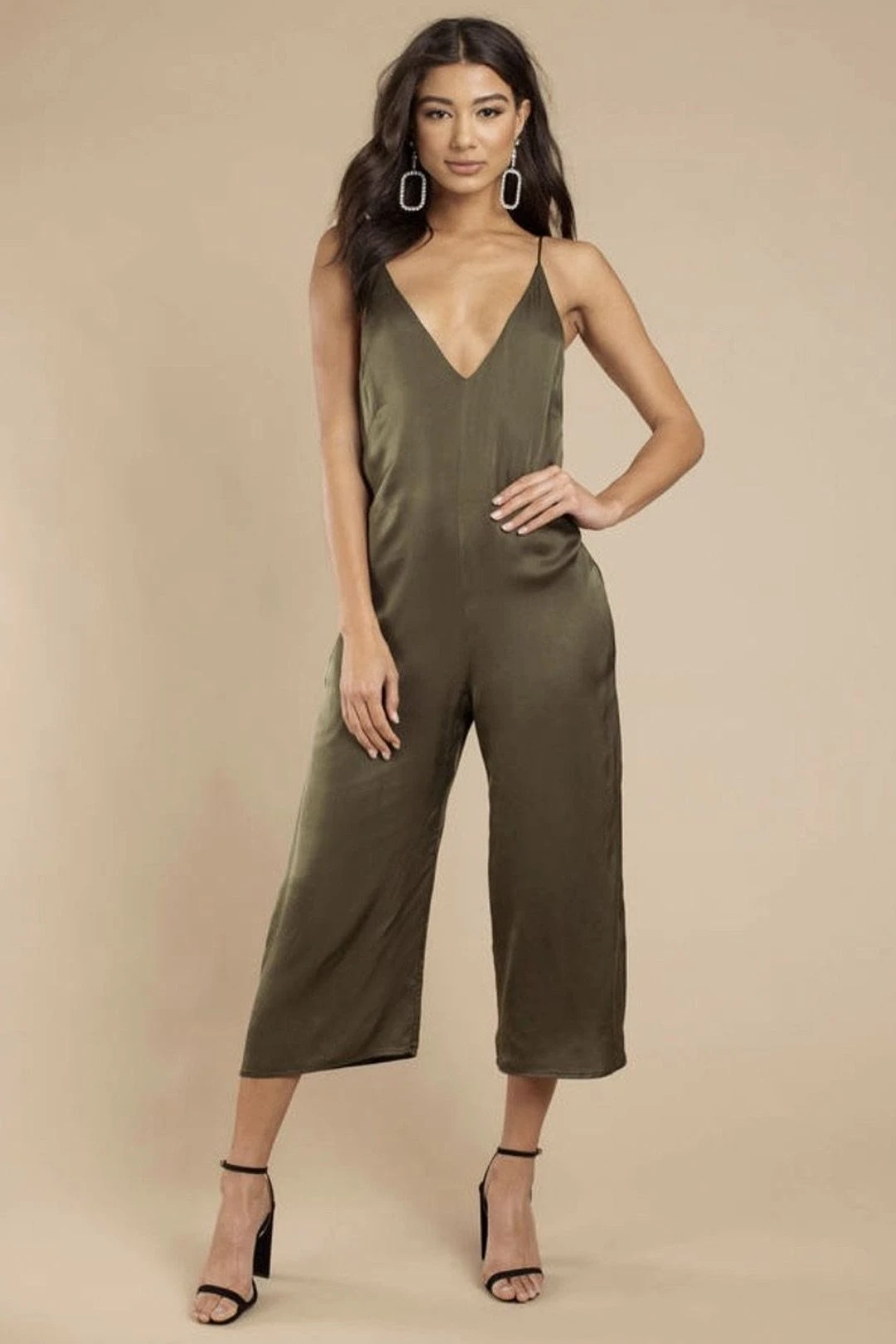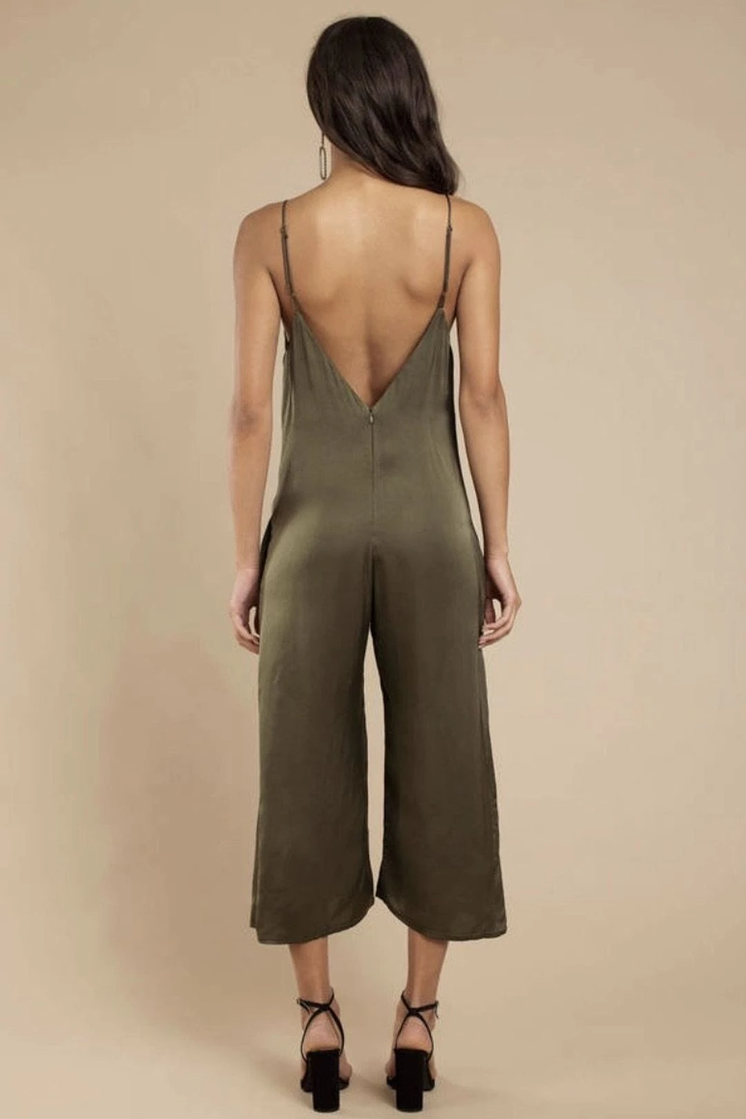 This culotte jumpsuit features cami straps, plunging v-neckline, deep v back, cropped legs, and gorgeous satin throughout. Get ready for date night in this deep plunge jumpsuit and pair it with barely-there heels or mules.